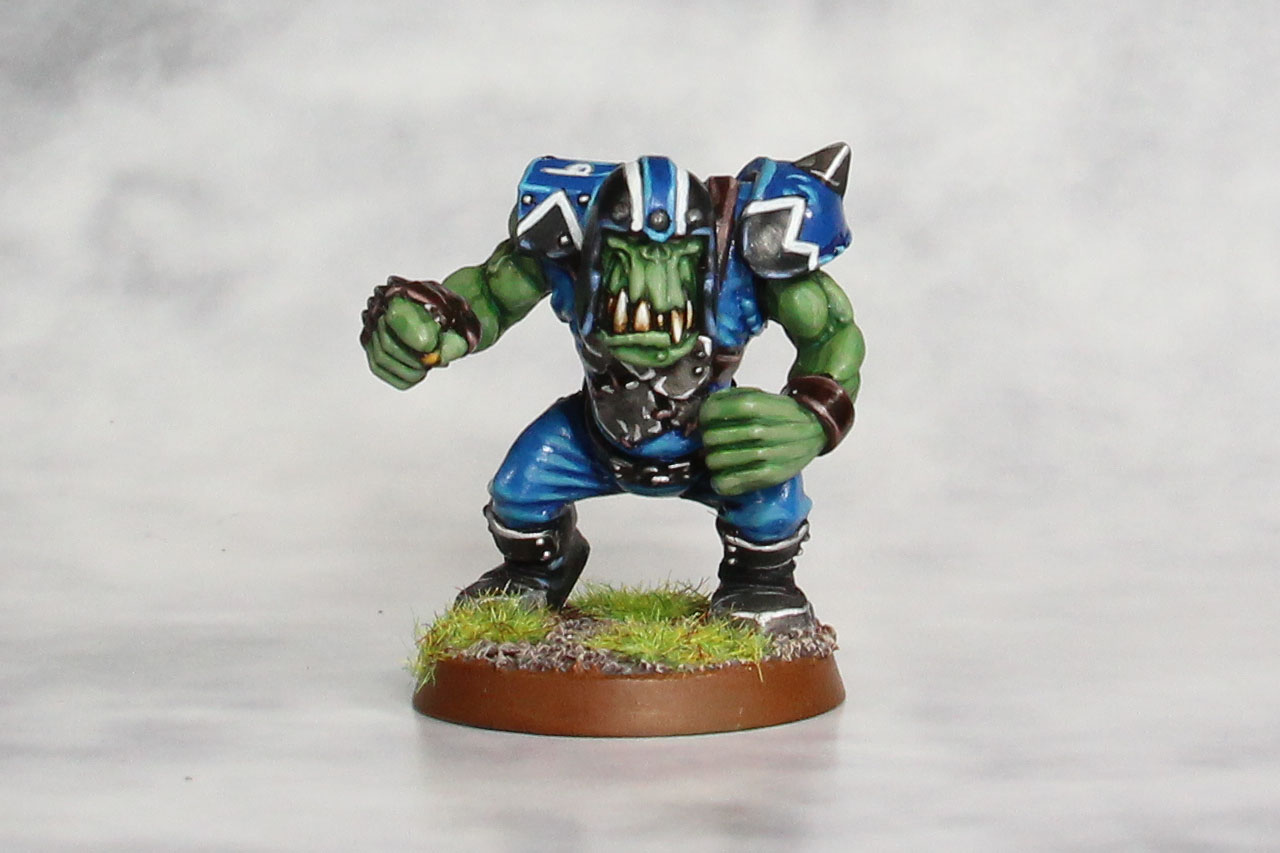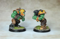 Die beiden sind die ersten echten Repaints und ich bin mit dem Ergebnis recht zufrieden. Als ich die beiden bemalt habe, war ich mir noch nicht ganz sicher mit dem Farbschema des Teams. Zwar hatte ich meine Hauptfarben gewählt, aber das Gesamtbild der Figur kann sich schnell verändern, indem man diese einfach an unterschiedlichen Stellen platziert. Bei den Fans war das nicht gravierend, da diese kein einheitliches Bild benötigen, aber da sich Blood Bowl am American Football orientiert, besteht der Wiedererkennungswert in einer möglichst einheitlichen Kleidung der Spieler.