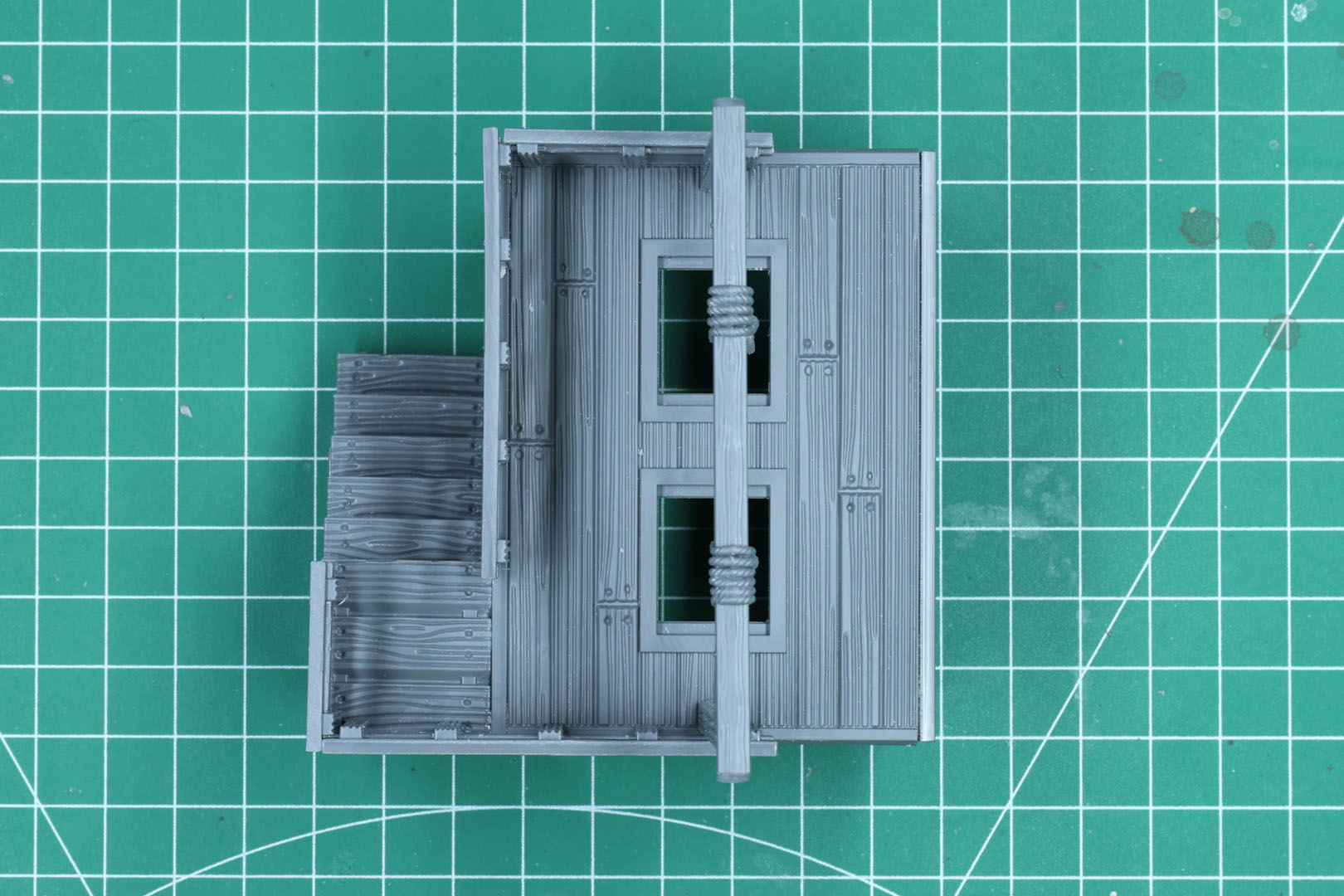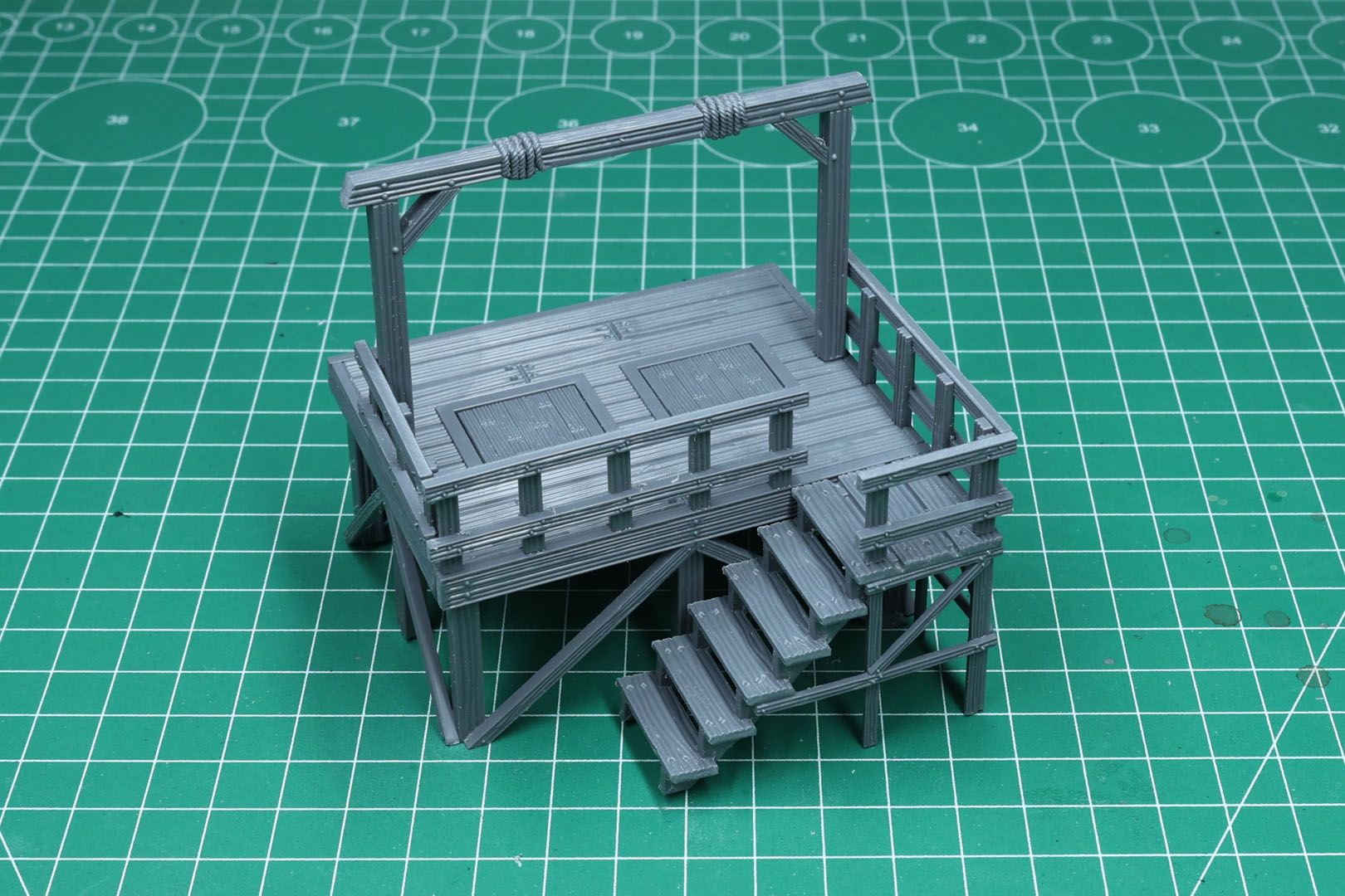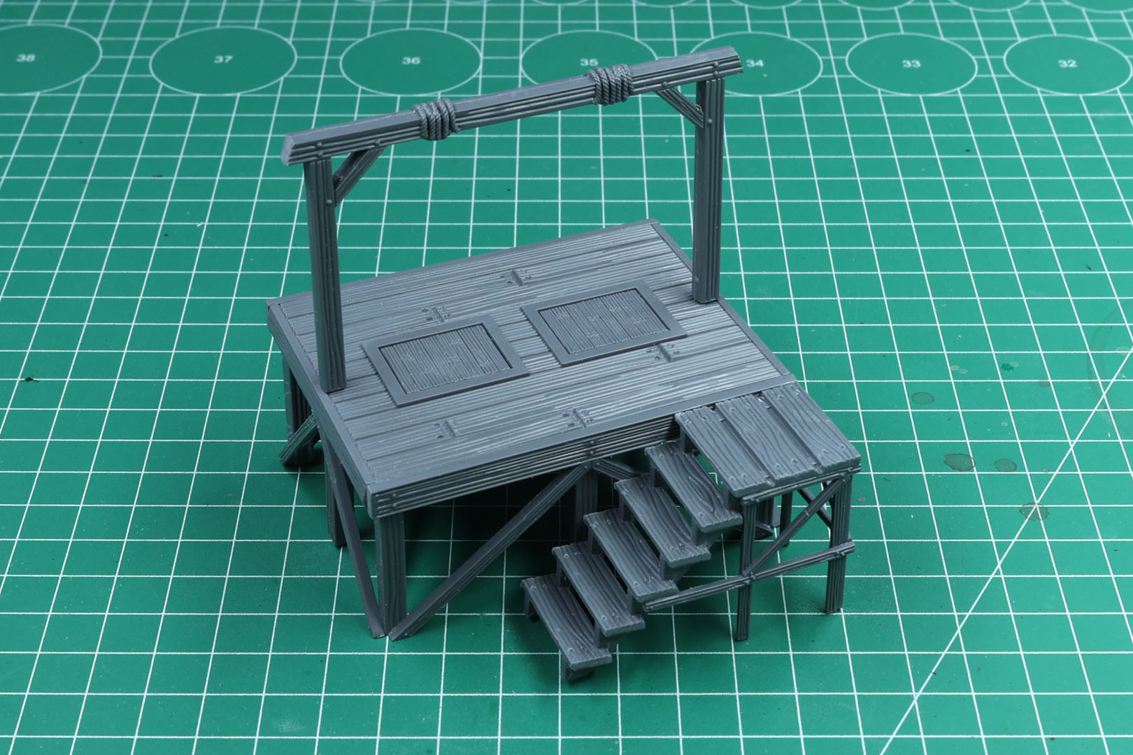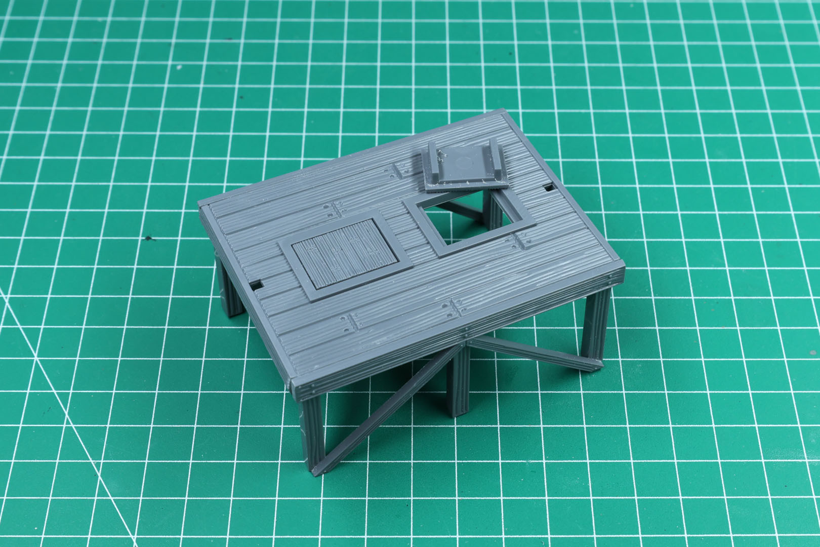 Die Hauptplattform besteht aus der Platte und den Streben. Es gibt zwei abnehmbare Falltüren. Diese sehen eher wie Sockel aus und lassen sich unten nicht aufschwingen.