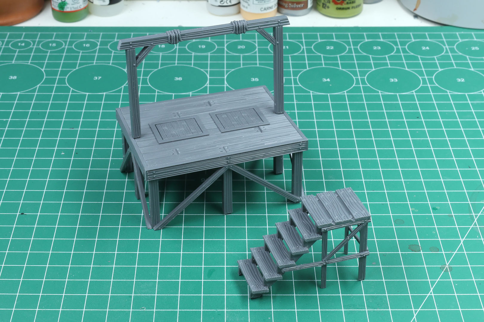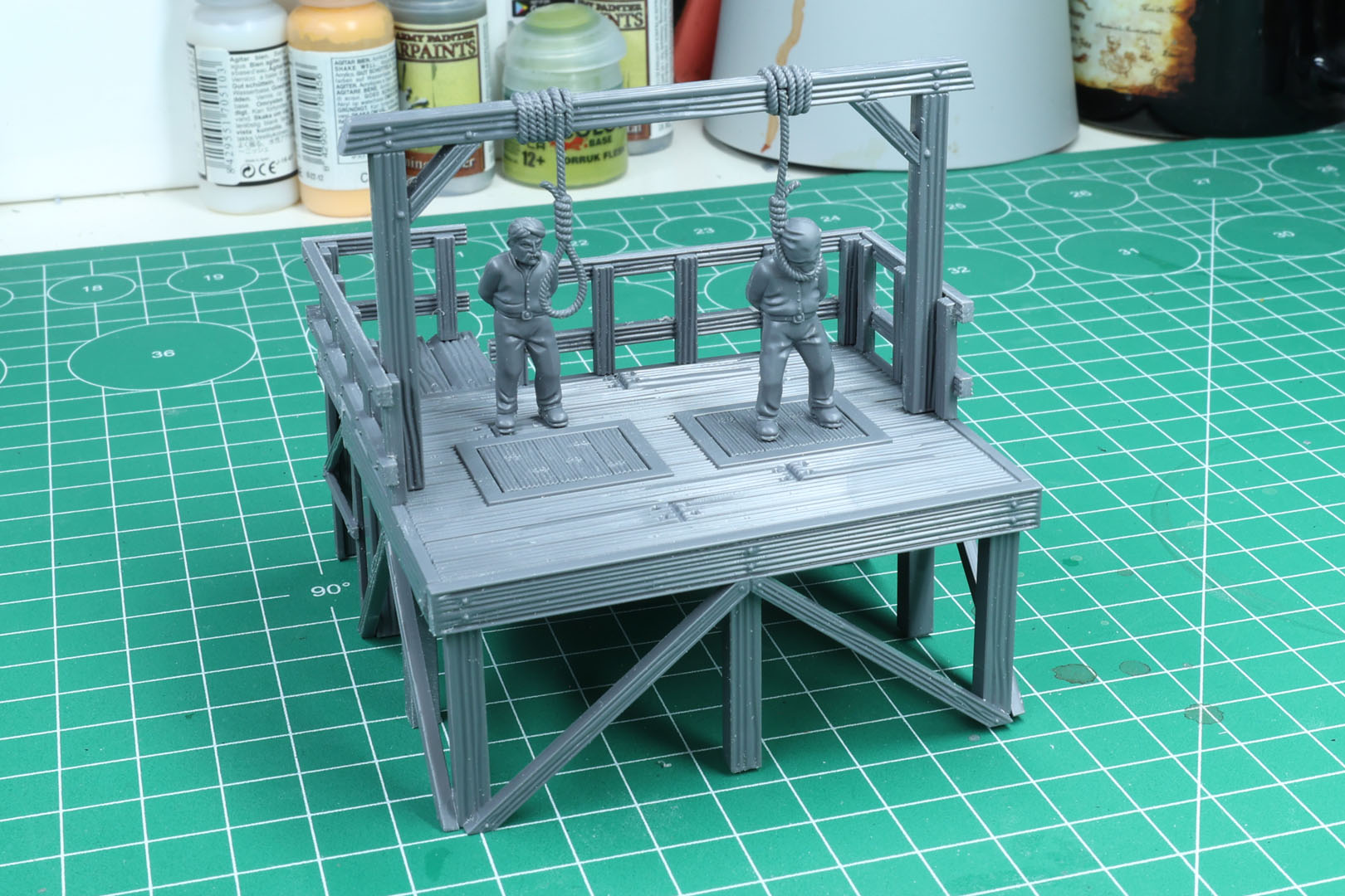 Sobald diese zusammengeklebt sind, kannst du das Problem durch Schleifen oder durch Aufkleben des Galgen auf einer Geländebase beheben.
