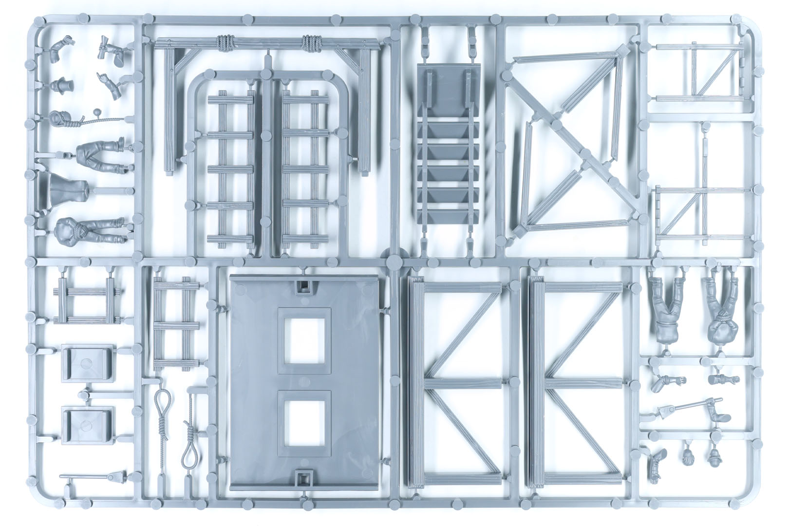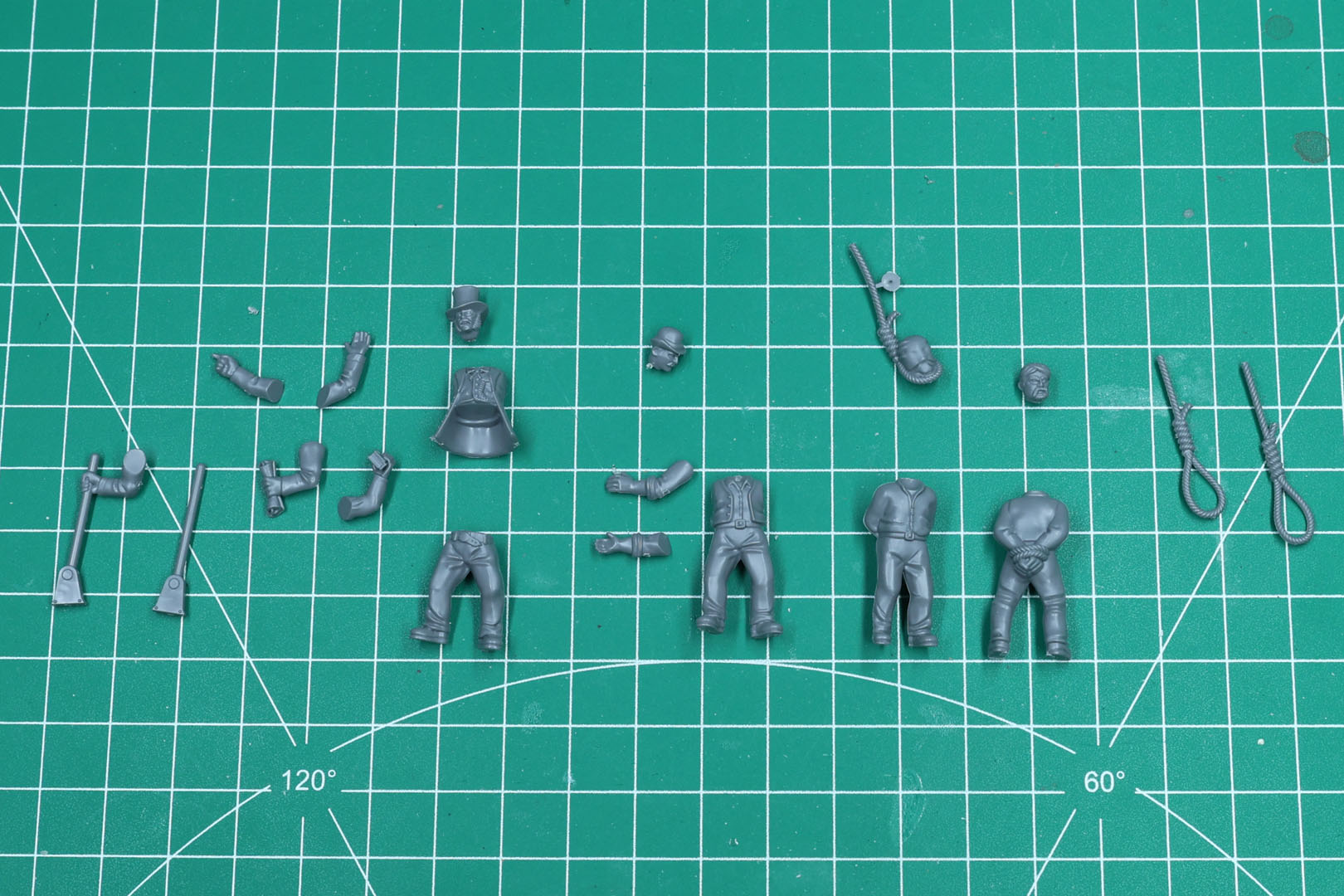 Der Galgen ist nun fertig, sodass wir die Miniaturen hinzufügen können. In diesem Set sind vier enthalten, mit ein paar Optionen zur Auswahl. Diese Miniaturen passen zu den normalen Plastikminiaturen aus dem Sortiment, und du kannst Köpfe und Arme austauschen, wenn du willst.