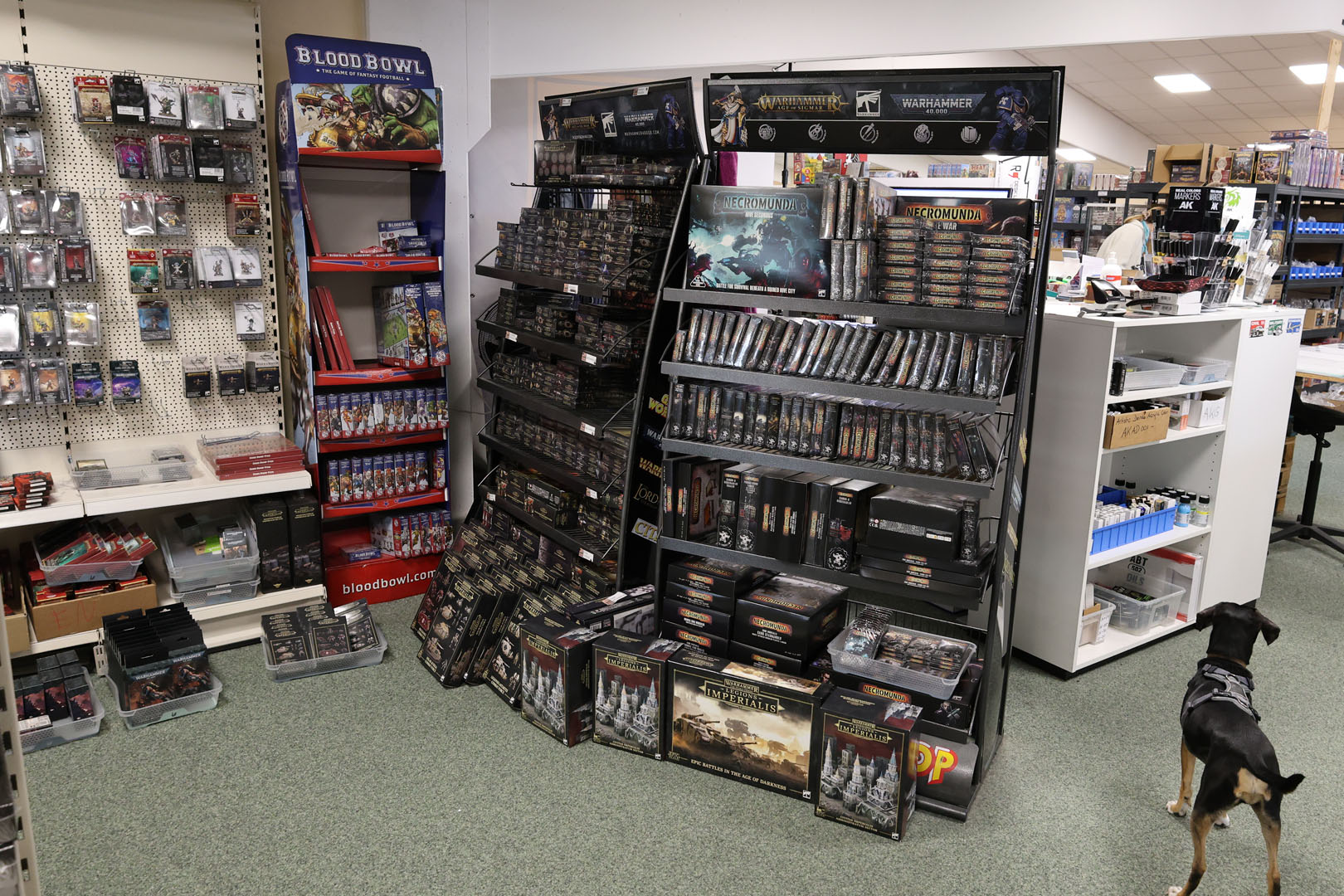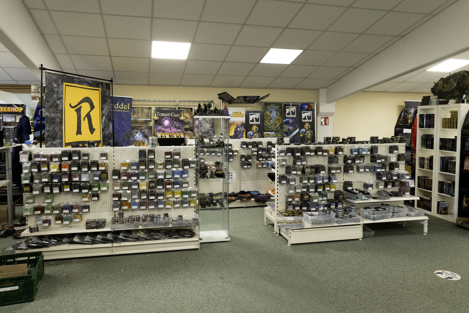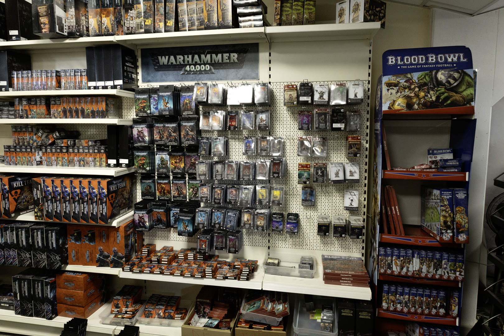 Hinter den Spieltischen beginnt der Ladenbereich, in dem ihr euch mit Miniaturen, Würfeln und allerlei Zubehör - vom Kleber über Pinsel bis hin zur Basegestaltung - verschiedenster Hersteller eindecken könnt.