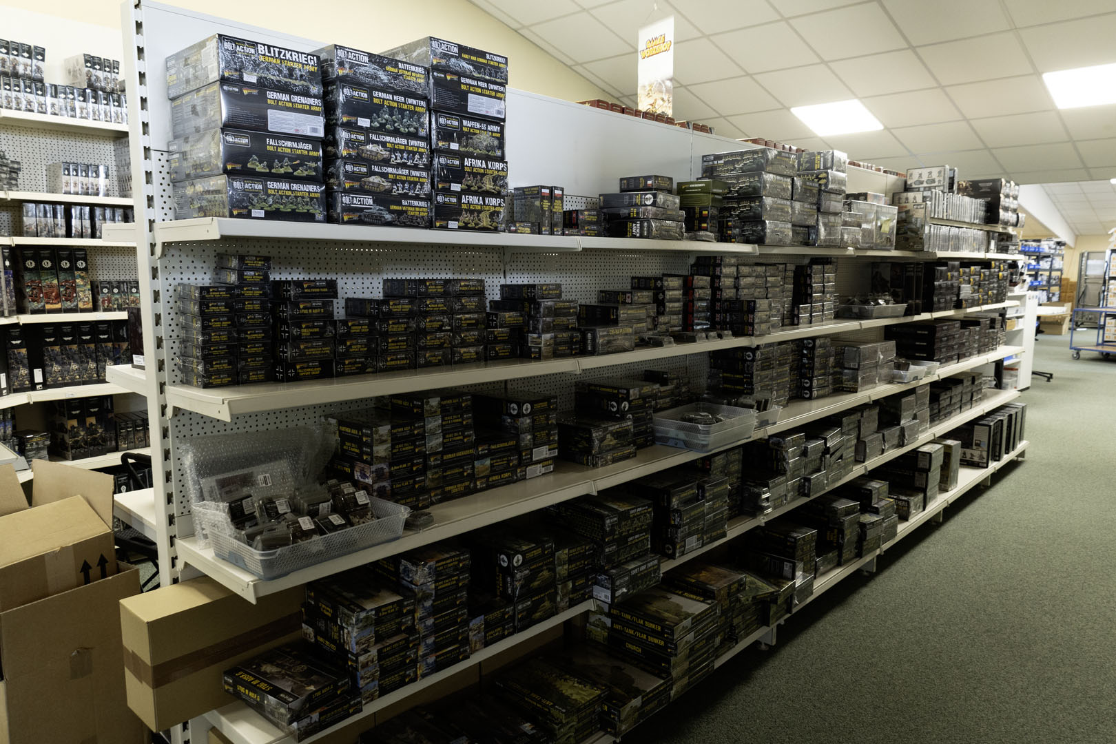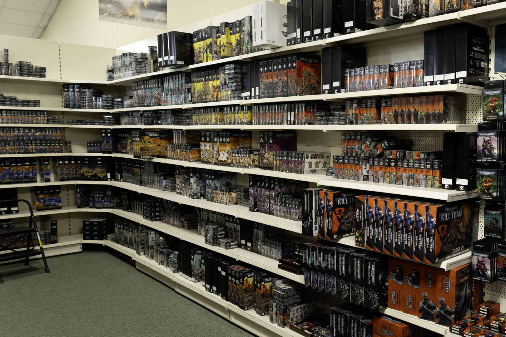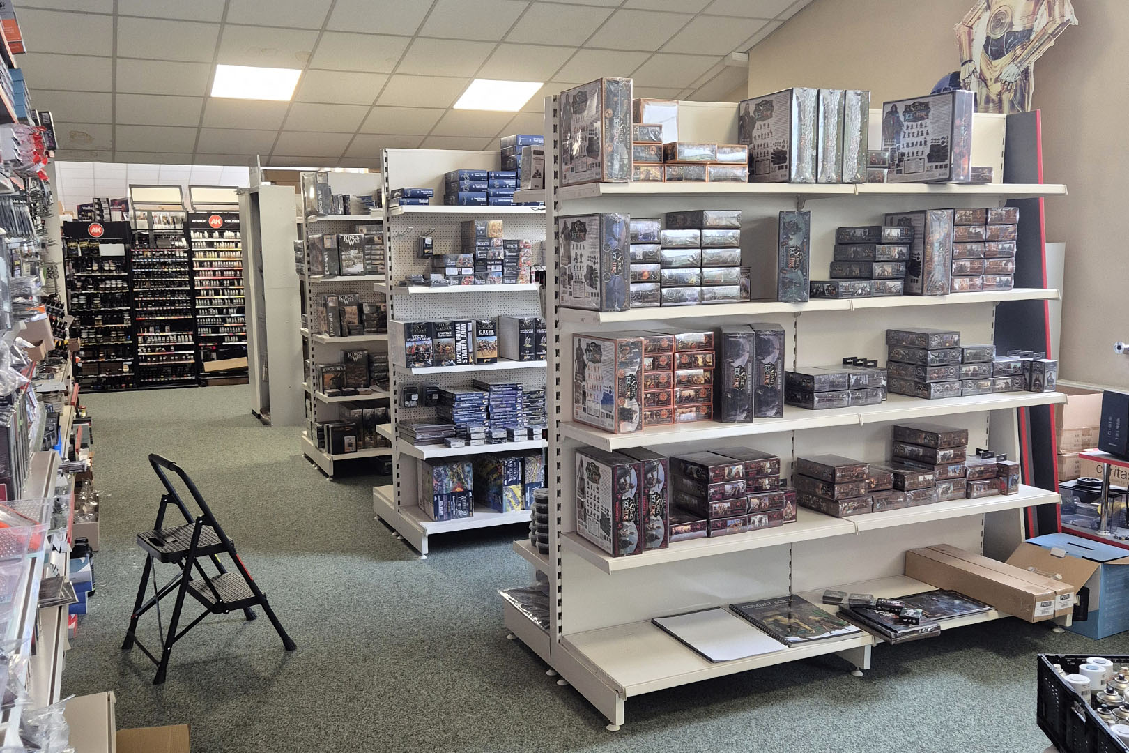 Hinter den Spieltischen beginnt der Ladenbereich, in dem ihr euch mit Miniaturen, Würfeln und allerlei Zubehör - vom Kleber über Pinsel bis hin zur Basegestaltung - verschiedenster Hersteller eindecken könnt.