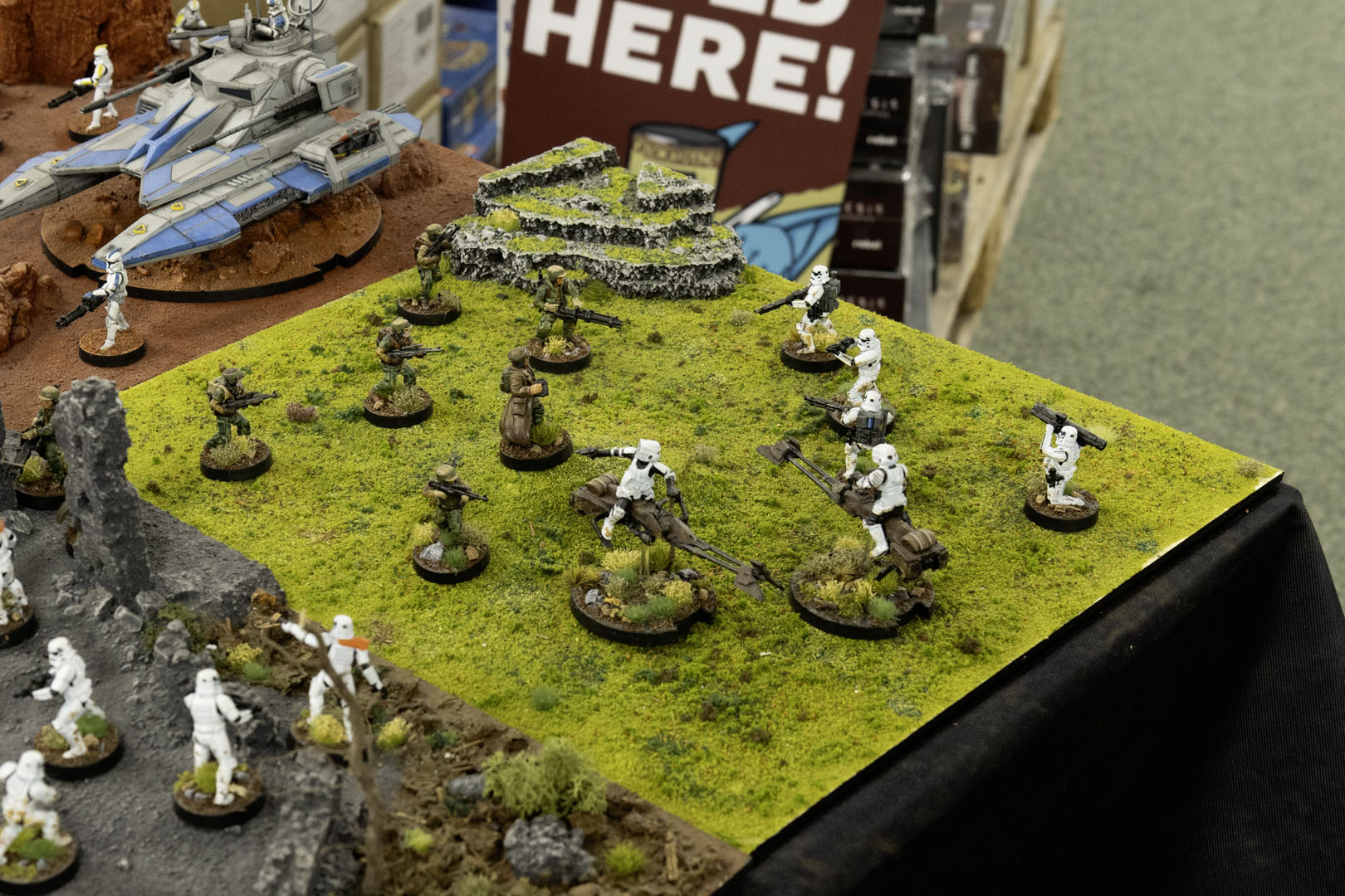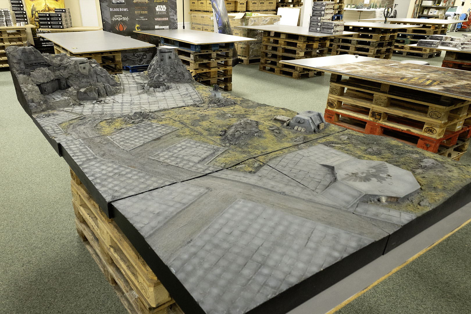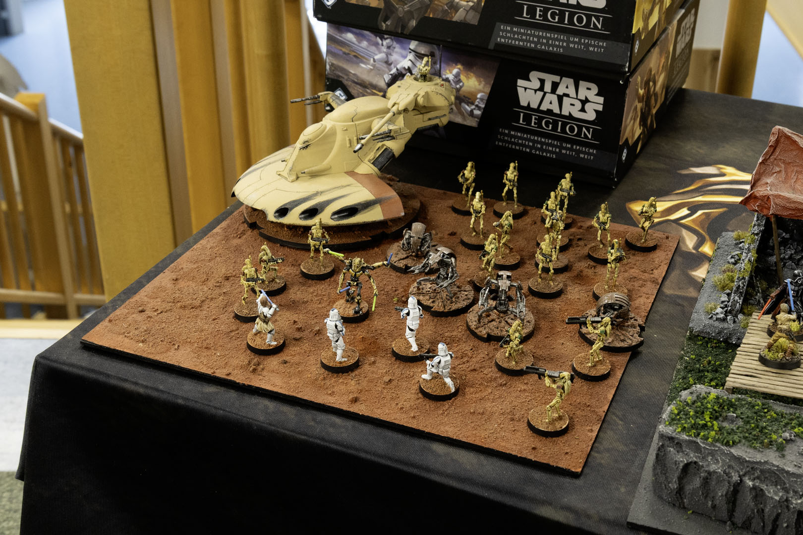 Neben den freien Spielplatten gibt es auch einige gestaltete Platten und Displays, zum Beispiel diesen 40k-Spieltisch mit Bastion oder den bewaldeten Schneetisch. Das „Vier Jahreszeiten”-Display von Star Wars Legion, welches die verschiedenen Epochen des Spiels zeigt, hat mir ebenfalls sehr gut gefallen.