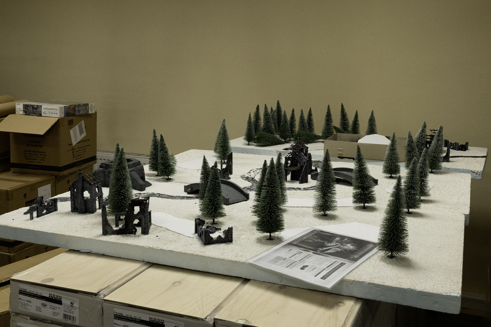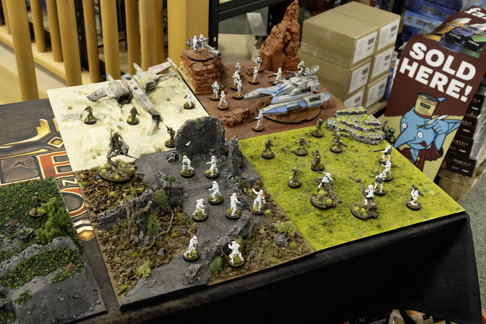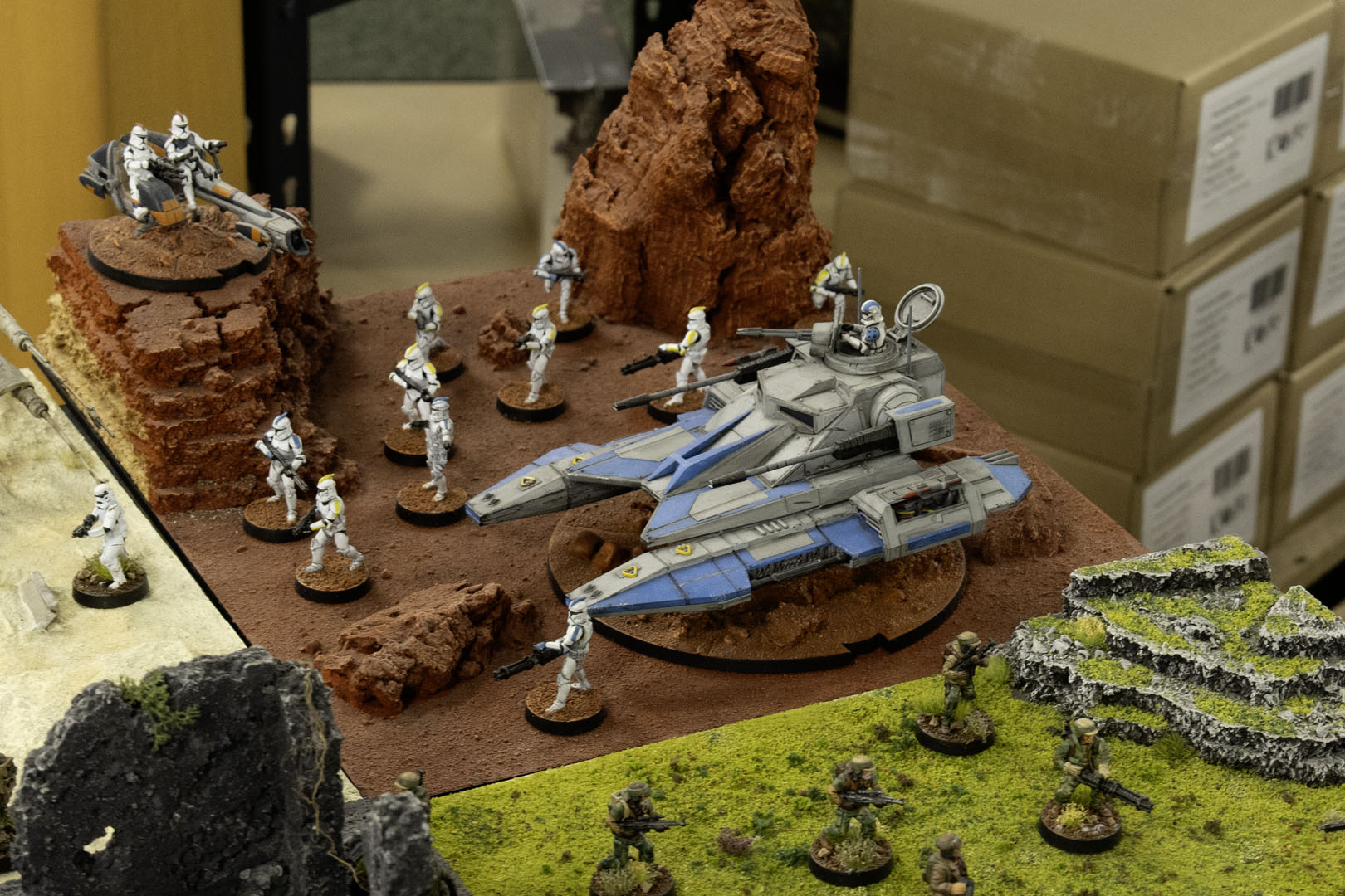 Neben den freien Spielplatten gibt es auch einige gestaltete Platten und Displays, zum Beispiel diesen 40k-Spieltisch mit Bastion oder den bewaldeten Schneetisch. Das „Vier Jahreszeiten”-Display von Star Wars Legion, welches die verschiedenen Epochen des Spiels zeigt, hat mir ebenfalls sehr gut gefallen.