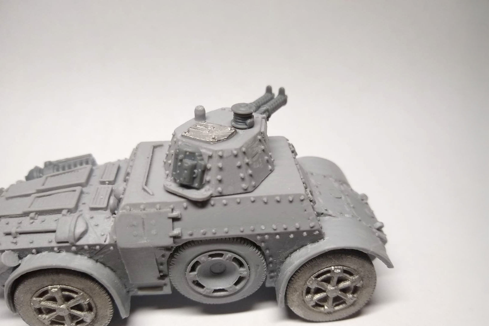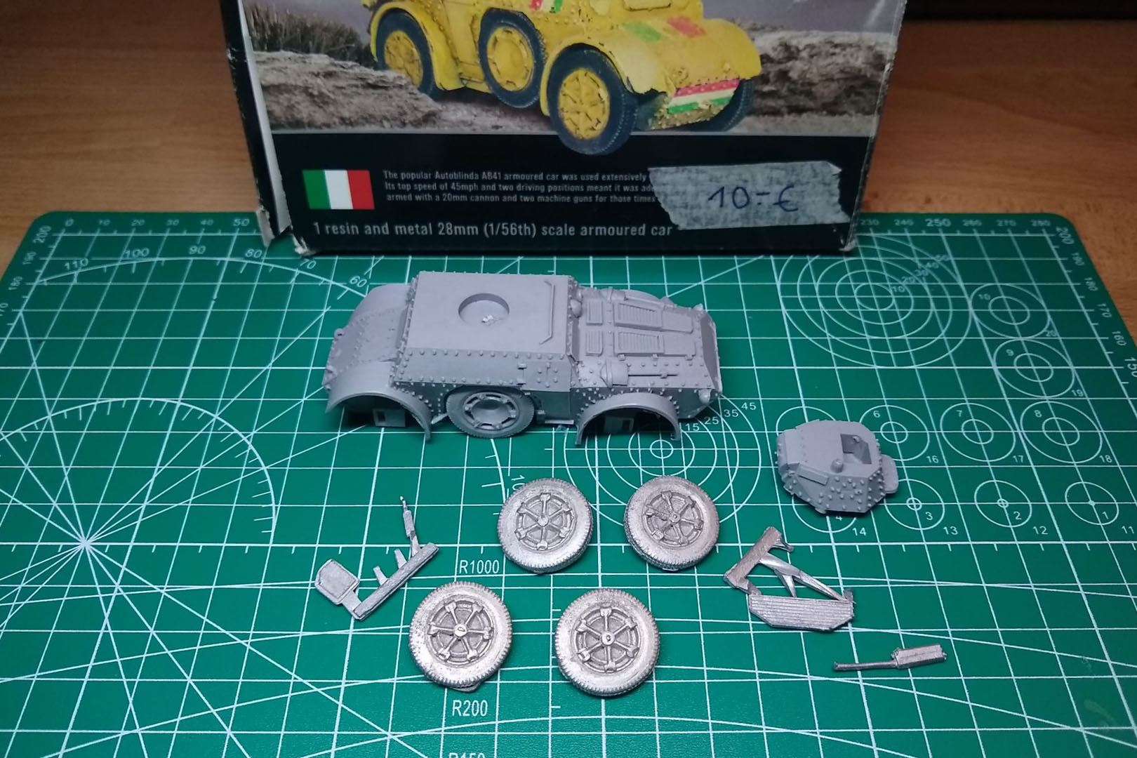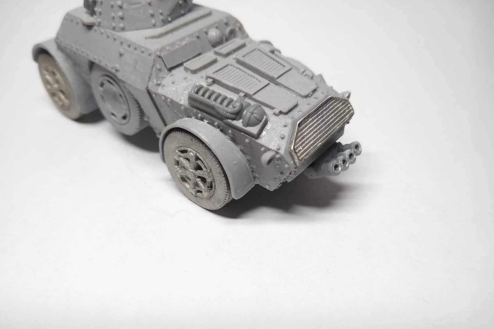 Zum Beispiel habe ich mal diese italienische Autoblinda auf der Ad Arma Con für einen Zehner abstauben können. Ursprünglich wollte ich daraus nur Scatteglände bauen und ich musste ein paar Macken reparieren, wie diesen abgebrochenen Kotflügel, aber jetzt soll der Wagen die Stelle des Humvee in der Armee einnehmen.