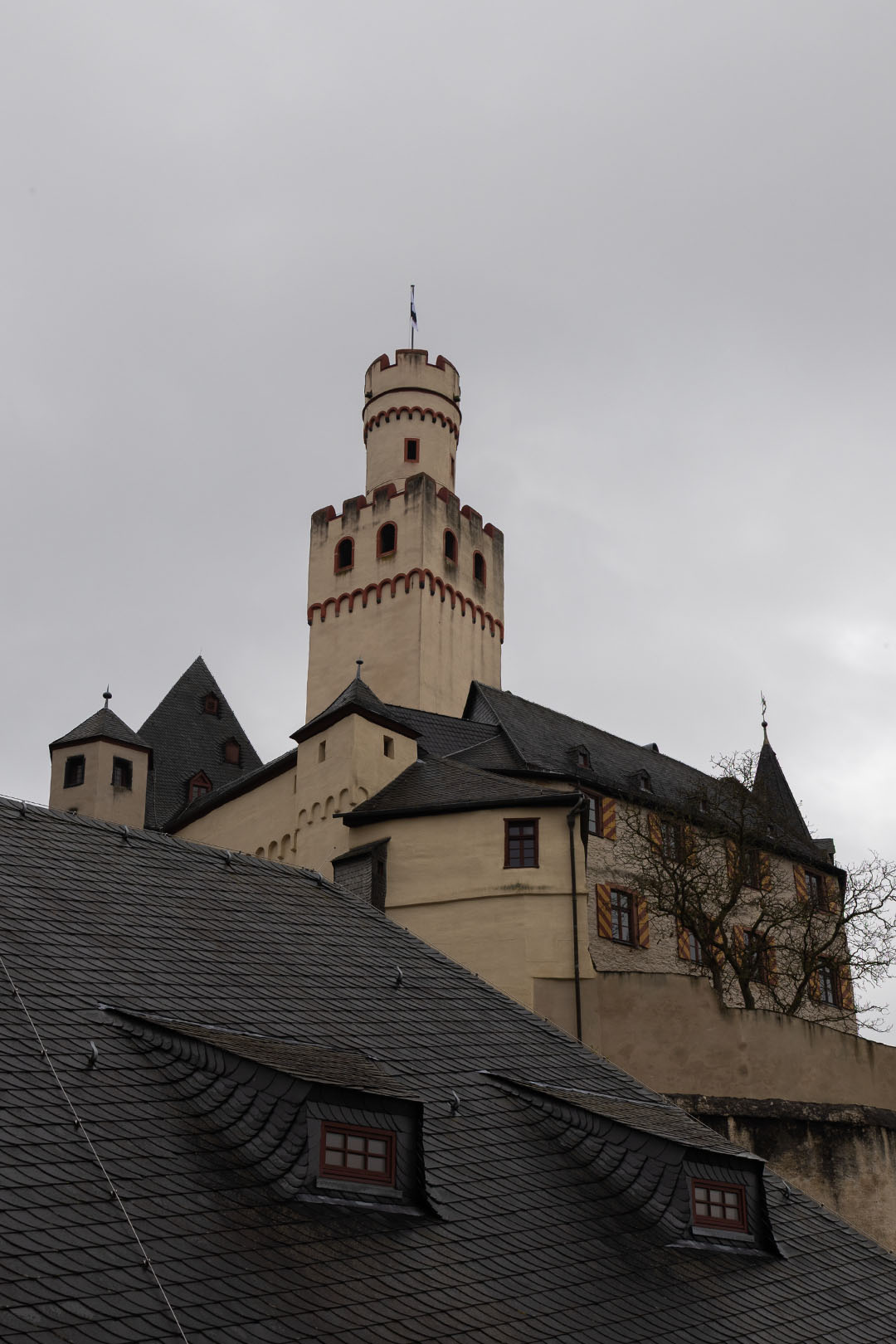 Die Marksburg in Braubach, Rheinland-Pfalz, ist eine mittelalterliche Höhenburg. Sie wurde im frühen 12. Jahrhundert gebaut, um die Stadt zu schützen und die Handelswege entlang des Rheins zu bewachen. Erstmals urkundlich erwähnt im Jahr 1231, wurde sie nach ihrem Erwerb im Jahr 1283 von den Grafen von Katzenelnbogen erheblich erweitert, die ihr die markanten gotischen Elemente hinzufügten, die ihr heutiges Aussehen prägen. Im Gegensatz zu vielen anderen Rheinburgen wurde die Marksburg nie im Krieg zerstört und überstand den Dreißigjährigen Krieg und die darauf folgenden Konflikte nahezu unbeschadet.