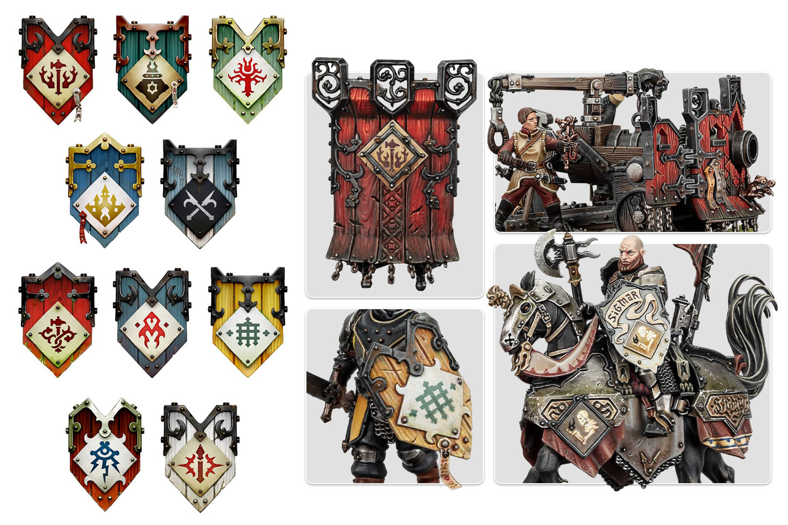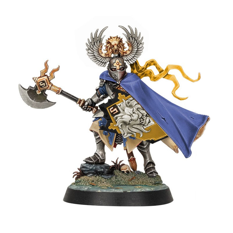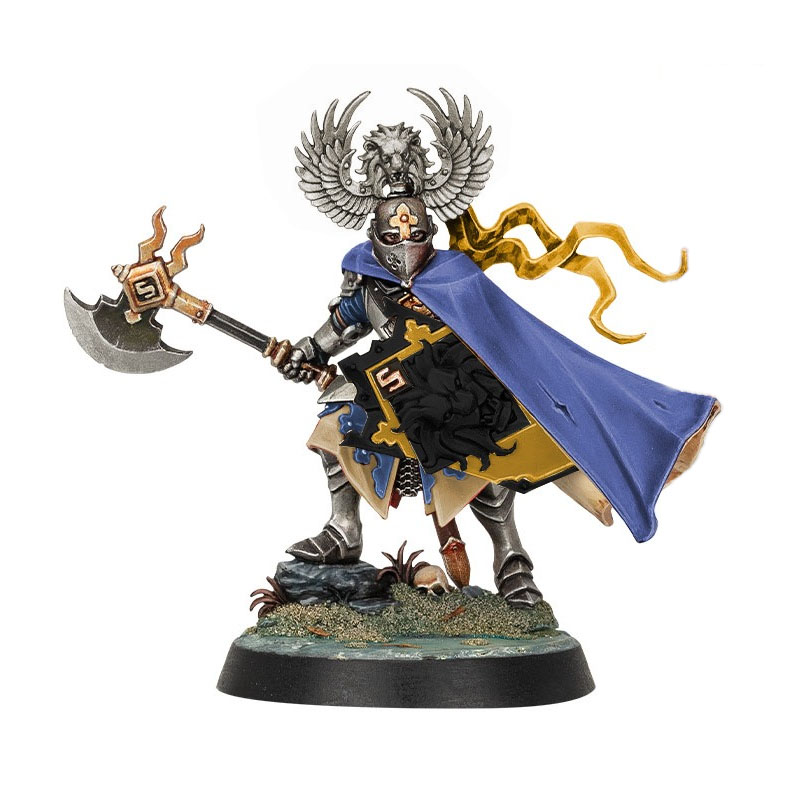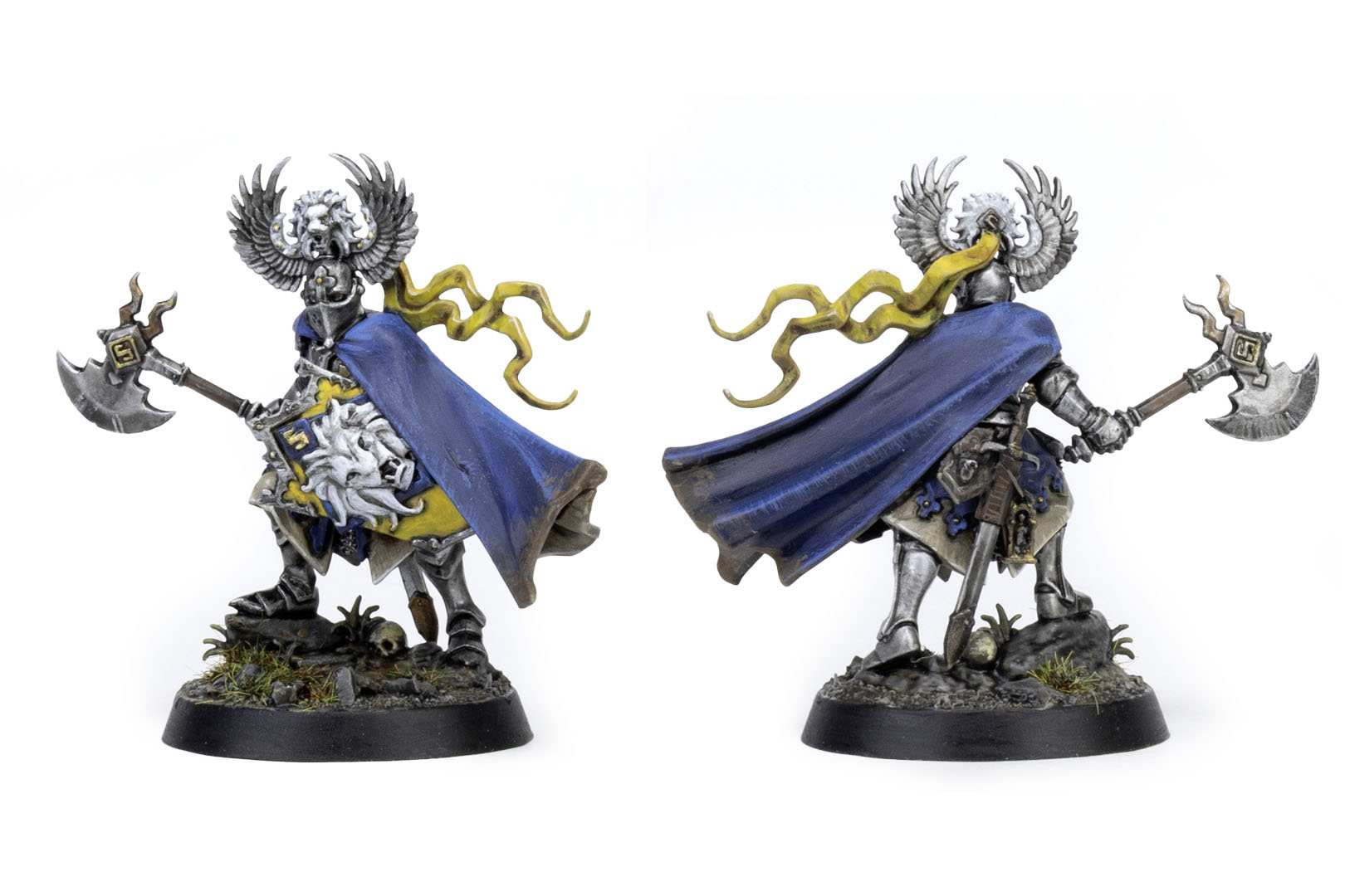 Bei der Farbwahl für den Manticore Knight suchte ich online nach Inspiration, unter anderem in den Artikeln zu Cities of Sigmar auf Warhammer Community. Ich überlegte, ihn in Blau oder einer Kombination aus Blau und Gelb zu bemalen. Das auffällige gelbe Schild mit einem Torsymbol und schwarzer Verzierung fiel mir ins Auge, ebenso wie das klassische Aussehen der Ritter von Dol Amroth aus der Lord of the Rings-Reihe (das Blau, die Helmzier und die Verwendung einer begrenzten Farbpalette sind eine große Inspiration). Ich habe auch nach blauen und gelben Wappen recherchiert und dabei u.a. auf bayerische Ritter gestoßen, die auch den Löwen als Element einbinden, und mir ist dann auch eine gewisse Ähnlichkeit mit der Allianz-Fraktion aus Warcraft aufgefallen, durch das Wappen und Farbwahl.