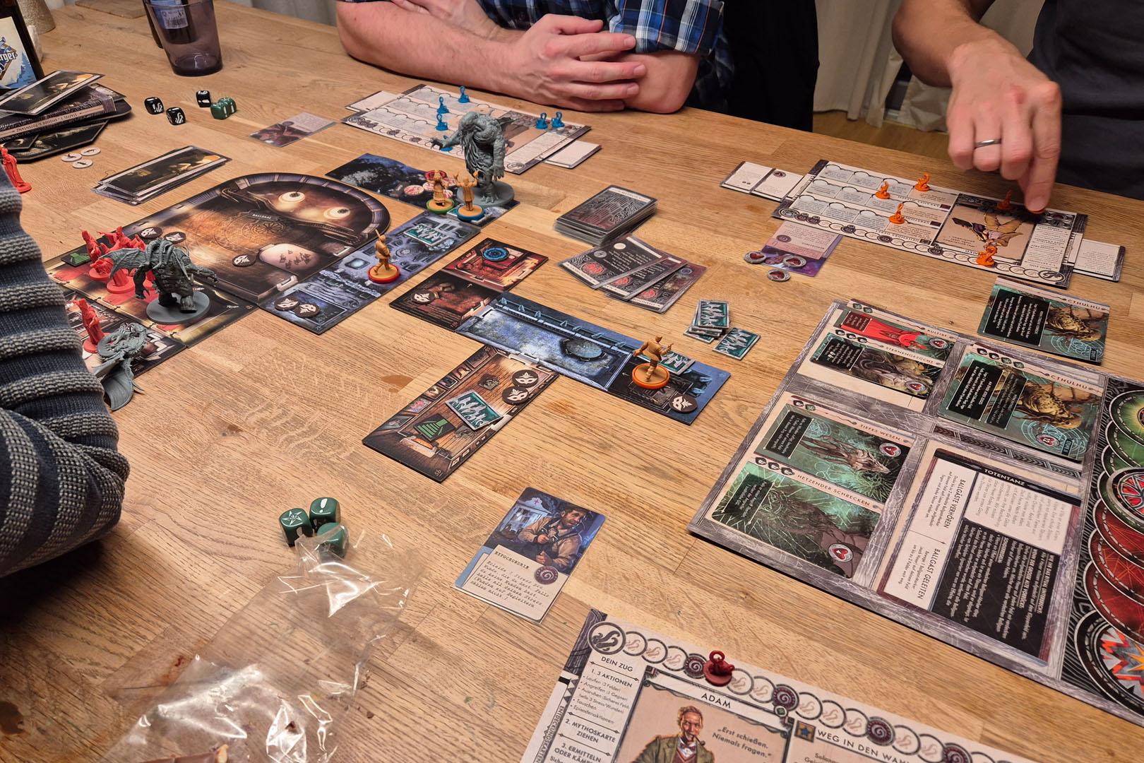 Und gleich am Tag nach meiner Rückkehr von einem ganzen Wochenende voller Malerei hatte ich meinen unregelmäßigen Brettspielabend und wir haben ein bisschen Cthulhu – Death May Die gespielt.