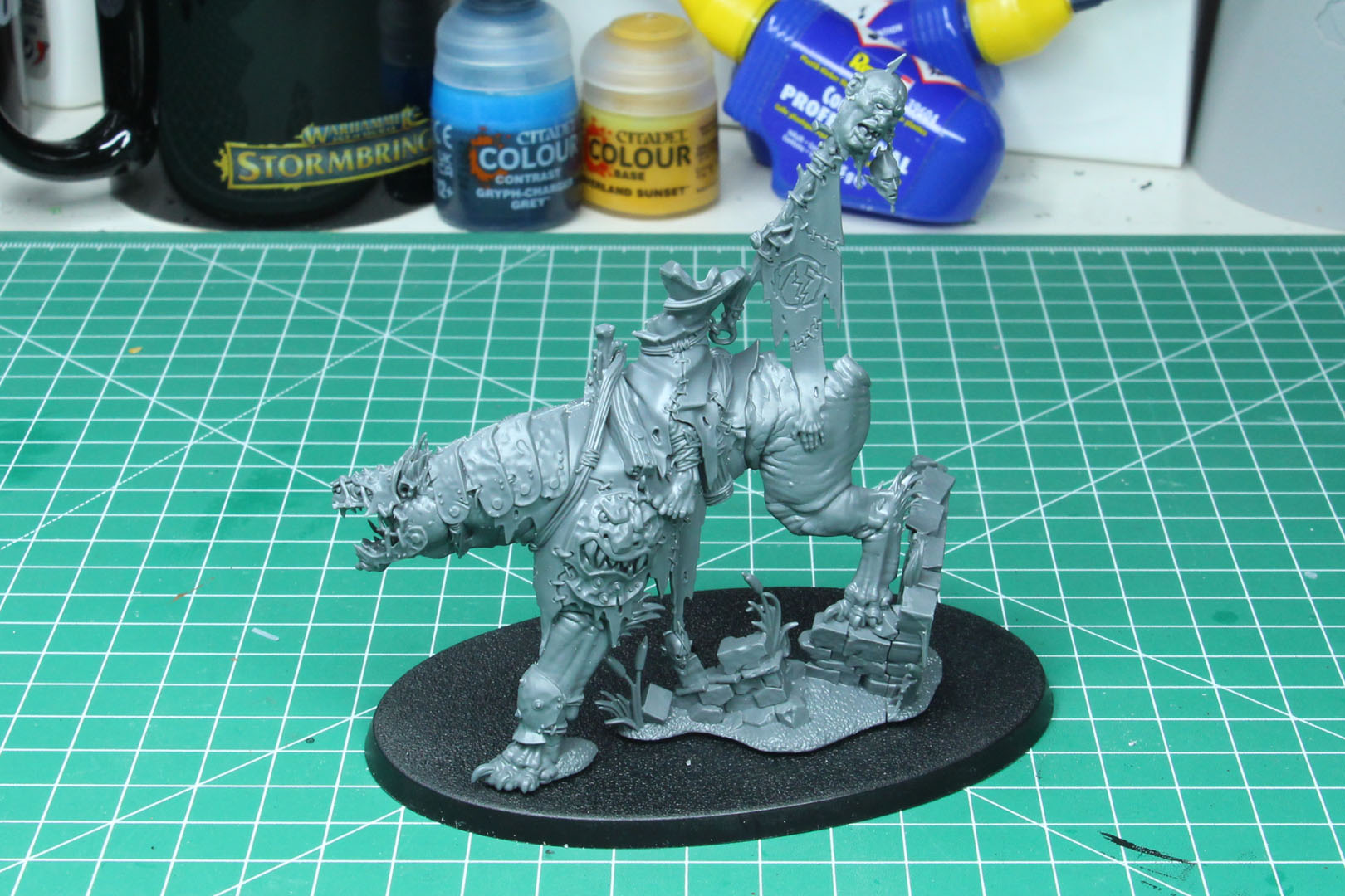 Um das auszugleichen, hab ich mir den Kruleboyz Killaboss auf Great Gnashtoof / Killaboss auf Großem Schnappzahn geholt. Dieses Modell war ursprünglich in den Dominion-Starter-Sets für Age of Sigmar enthalten und ist derzeit als Teil der Orruk Warclans Spearhead erhältlich, genau wie der Murknob mit Beltcha Banna / Torfboss mit Sumpfgassbanna.