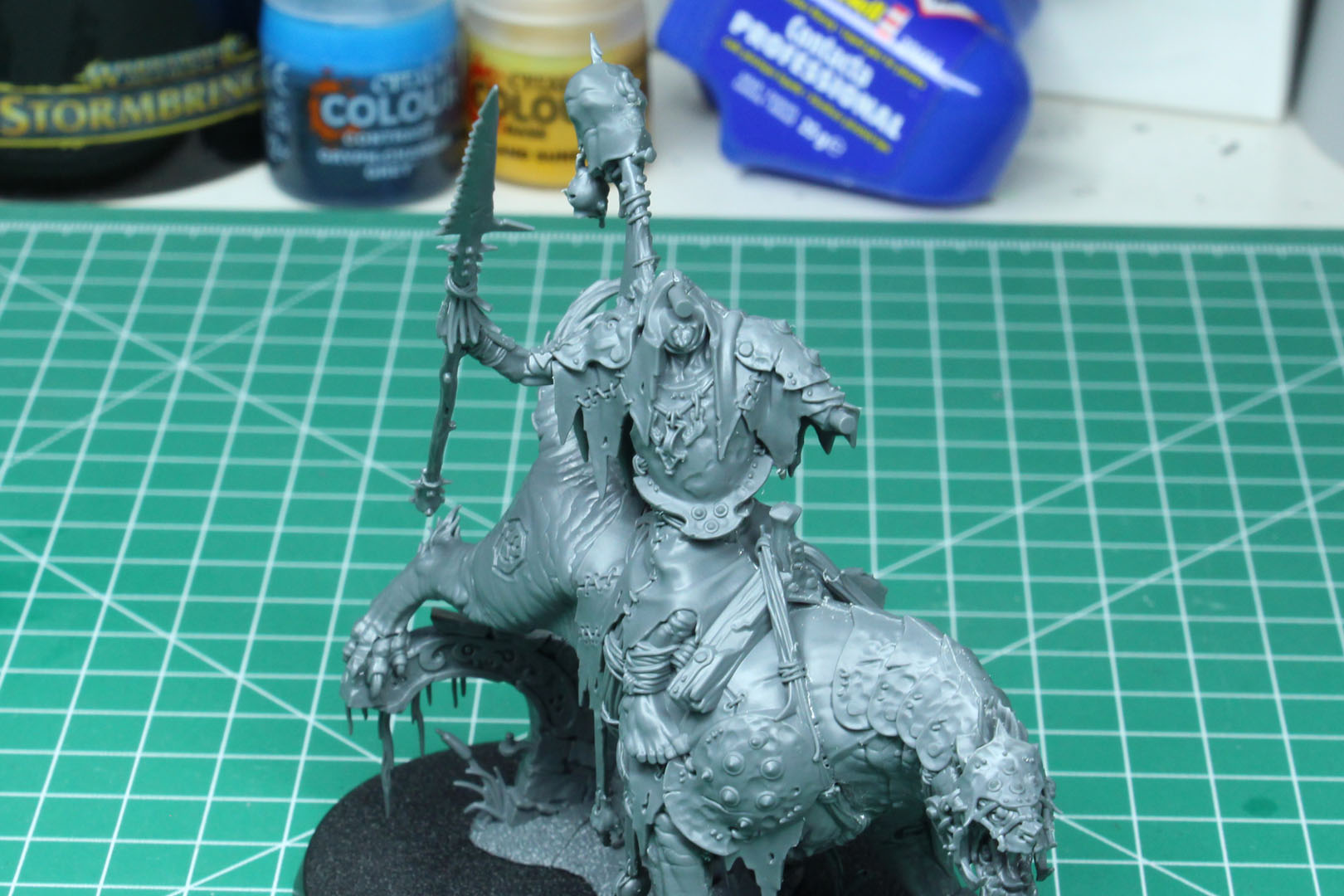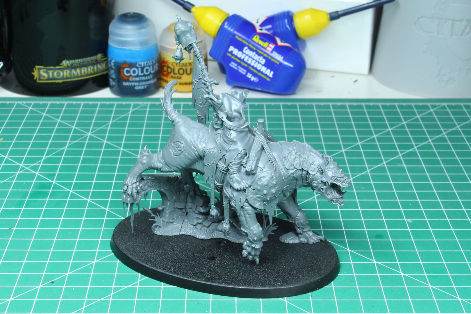 Zum schnellen Größenvergleich: Er ist sogar noch massiger als Lord Aquilor auf einem Gryph-Charger und sticht neben den Infanteriemodellen der Orruk / Kruleboyz deutlich hervor.