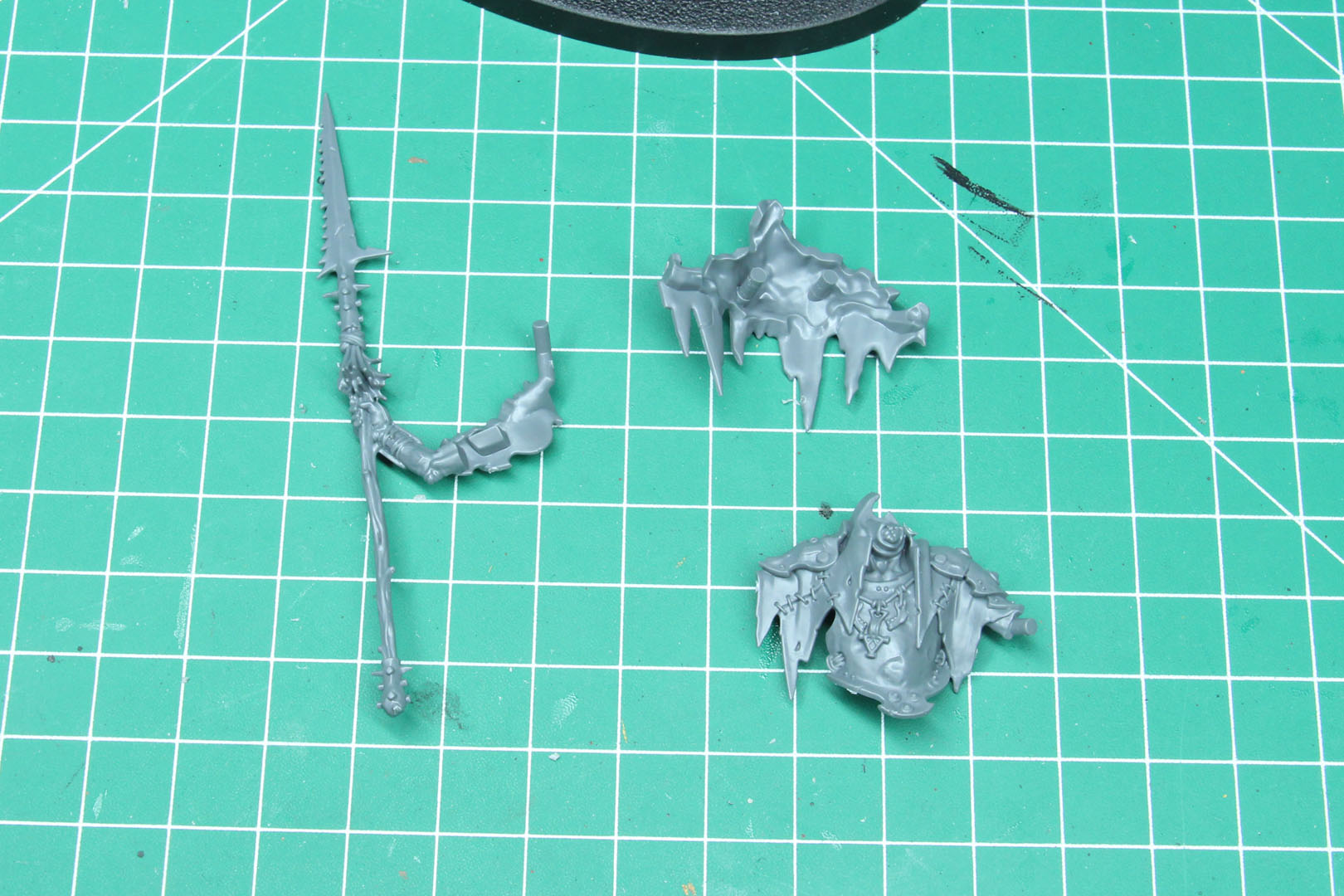 Von hier an bauen wir den Killaboss selbst fertig. Der Torso ist fest montiert, aber die Waffe oder den Kopf könnte man ohne großen Aufwand austauschen. Der Speer passt aber super zu dieser Figur.