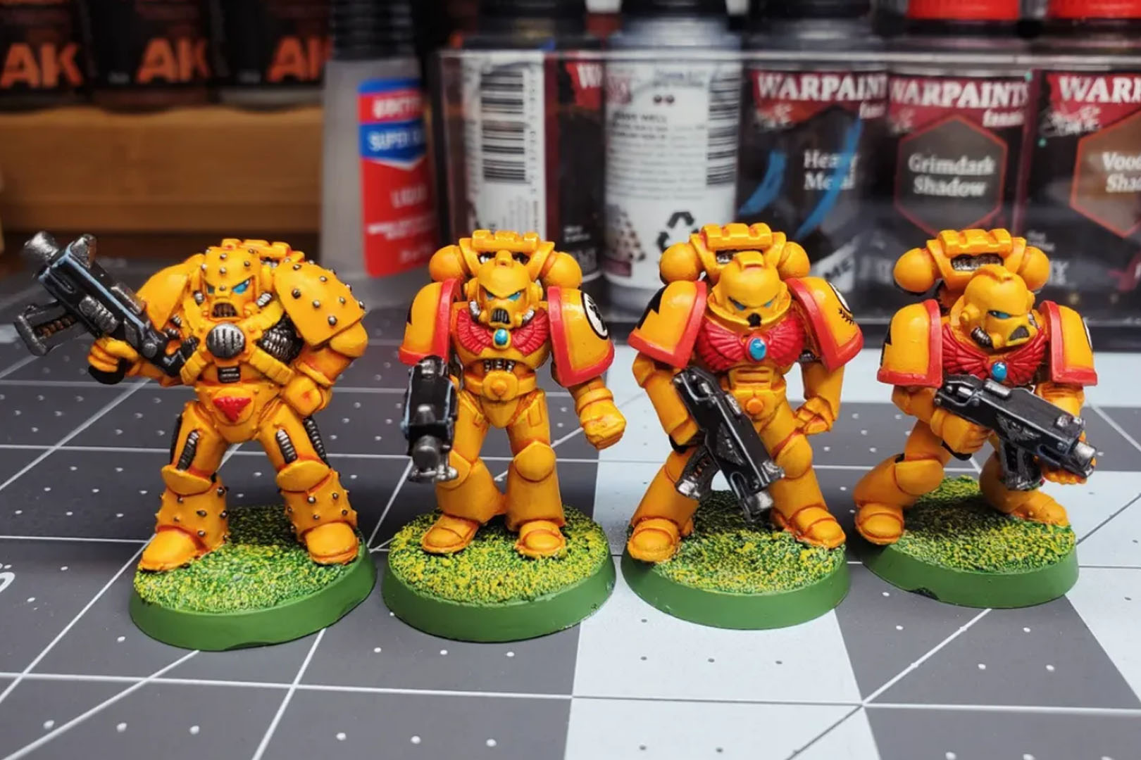 Bisher hab ich mir ein paar Dosen weiße Grundierung besorgt, zusammen mit Titans Hobby Imperial Yellow Matt Primer und Cassandora Yellow, weil ich einen wärmeren Ton haben will, der zu den Bemalschema der 2. Edition passt. Viele der Tutorials für Imperial Fists behandeln entweder das „kältere“ Aussehen der 30k Imperial Fists oder das sehr intensive Gelb der neueren Studio-Bemalung der Primaris Space Marines.