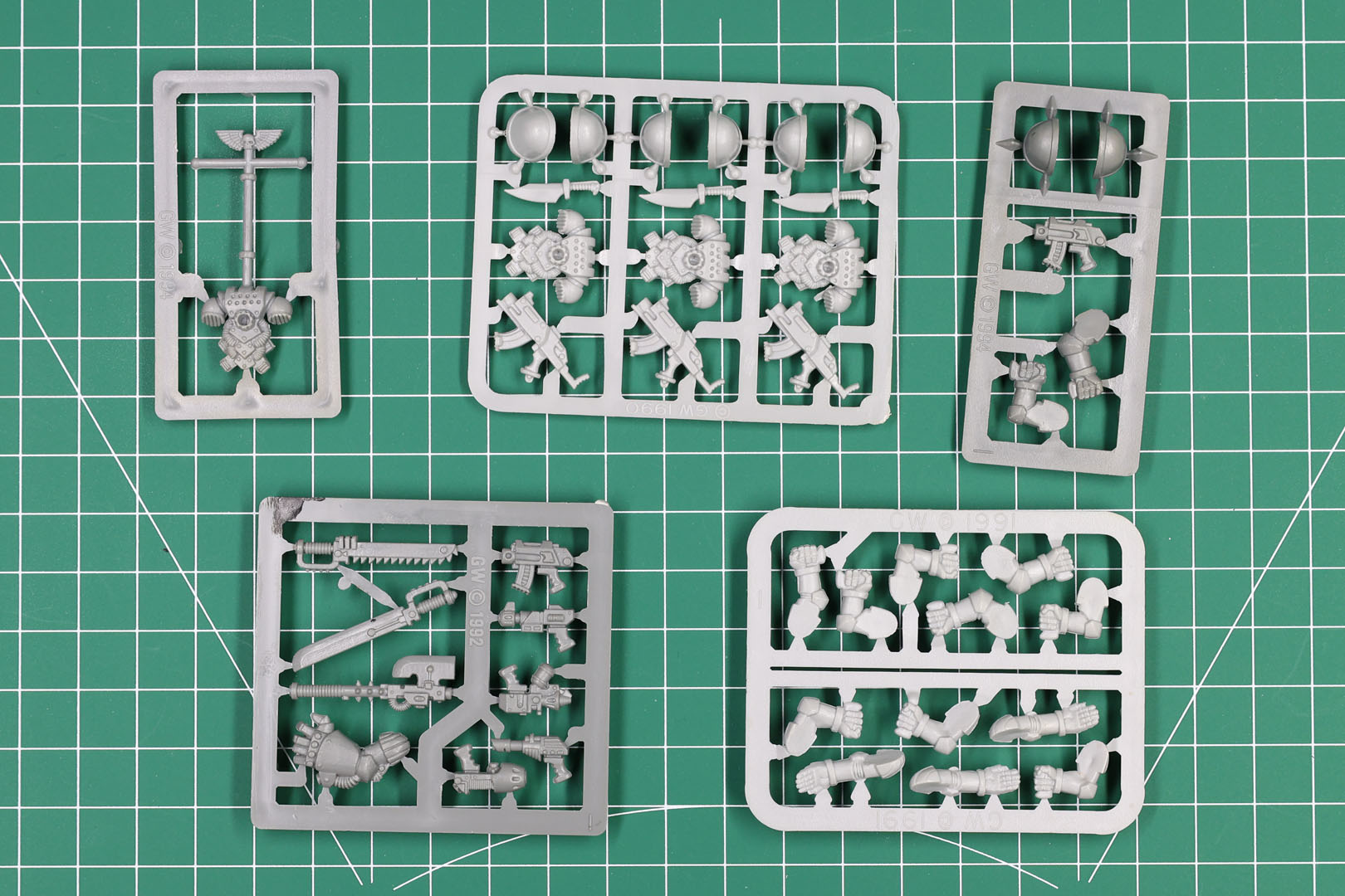 Sobald das Zinn sauber ist, besteht die nächste Herausforderung darin, die Modelle zu vervollständigen und zeitgemäß zu gestalten. Bei einem Retro-Projekt wie diesem aus der Mitte der 90er Jahre hat man meist Metallminiaturen (mit vielleicht einigen Monopose-Kunststoffminiaturen) und Kunststofffahrzeuge. Viele dieser Miniaturen hatten Zinnkörper mit Kunststoffzubehör für die Arme oder Waffen. Diese sind je nach Armee möglicherweise schwer zu bekommen. Zum Glück gibt es 2026 verschiedene Möglichkeiten, diese Lücken zu füllen, zum Beispiel durch 3D-Druck. Außerdem haben die Imperial Fists gegen Ende der 2. Edition ihr eigenes Set an Teilen bekommen, was mir weitere Optionen bietet.