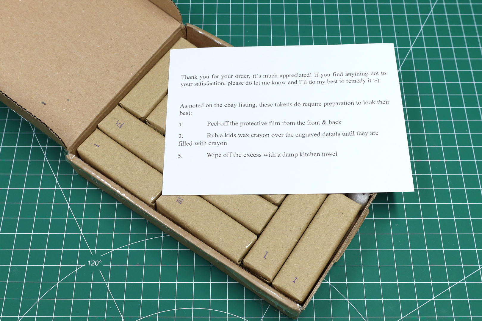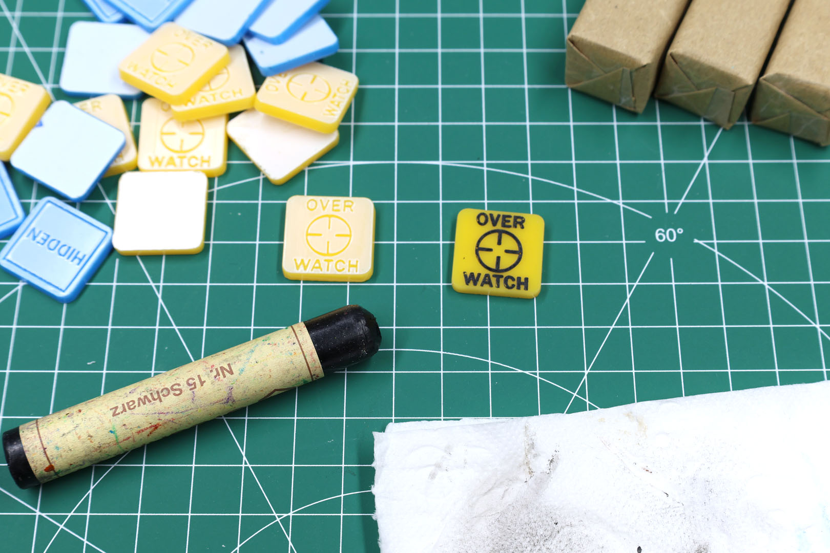 Nur zur Info: Das Entfernen der Folie auf beiden Seiten der Spielmarken dauert seine Zeit, ebenso wie das Bemalen. Rechne mit etwa 2 bis 3 Stunden, um das gesamte Set vorzubereiten und zu bemalen.