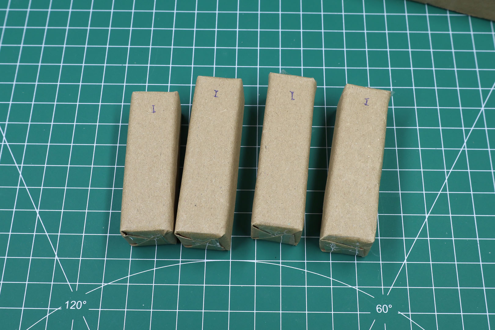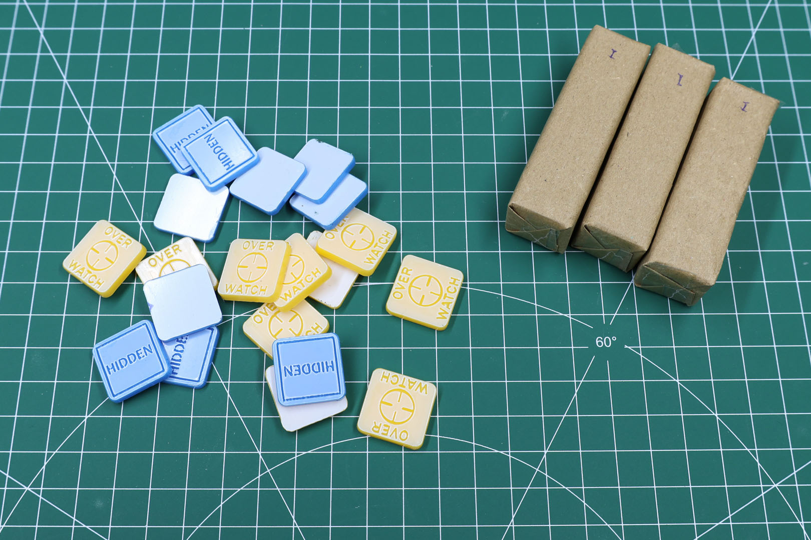 In dem dicht gepackten Paket waren mehrere Stapel von Spielmarken in braunem Packpapier. Diese waren nummeriert. Zuerst war ich mir nicht sicher, ob ein Set aus jeweils einem 1-2-3 bestand, aber die drei Sets waren jeweils mit einer eigenen Nummer gekennzeichnet, um zu zeigen, welche vier Stapel zusammengehören.
