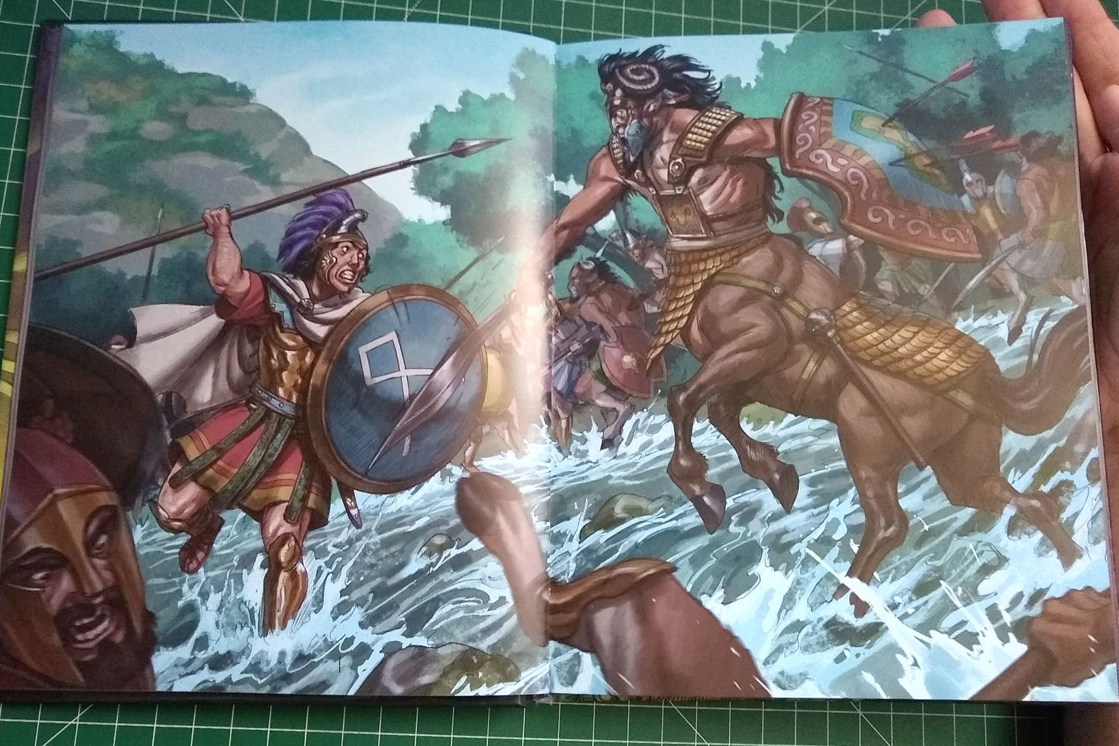 Wie auch Warriors of Athena Heroes, ist die Gestaltung des Buches auf sehr schönem Niveau, zeigt aber auch die gleichen Schwächen. Wieder fiel mir das wellige Papier direkt auf sowie ein Versatz in der ersten Bindung im Buch. Aus der Drucktechnischen Perspektive ging stellte sich mir hier die Frage, ob einige Entscheidungen evtl. nicht zu Gunsten der Produktionskosten getroffen wurden. Eine Bindung am Rücken ist eigentlich eine teure Verarbeitungsmethode und deutlich wertiger als z.B. ein Buch, dass durch eine Leimung gebunden wird. Der Einband wiederrum ist aus Hochglanzpapier, wo ein mattes Finish das Buch etwas langlebiger gemacht hätte.