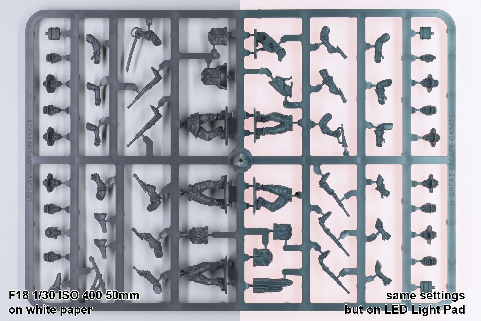 Und ich konnte es mittlerweile ausprobieren – und das hat super geklappt! Normalerweise fotografiere ich die Gussrahmen vor weißem Papier mit zwei Lichtquellen von oben. Ich habe das Gleiche gemacht, aber die Gussrahmen stattdessen auf das LED-Lichtpad gelegt – und schau dir mal den direkten Vergleich an. Das ist eine echte Verbesserung! Wie oben erwähnt, wird die erste Rezension, die davon profitiert, die zu den US-Kavallerie-Miniaturen sein.