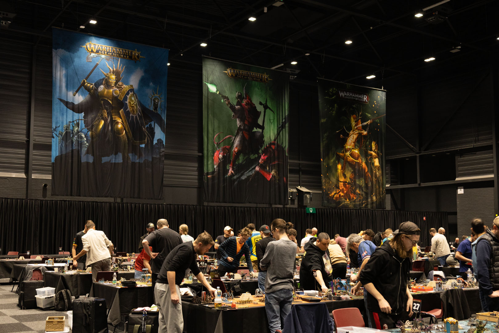 Der Turnierbereich selbst war in langen Reihen unter riesigen Bannern mit Warhammer-Artwork aufgebaut. Das erinnerte ein wenig an die Games Days von früher, bei denen dort die verschiedenen Banner der teilnehmenden Warhammer-Ladenlokale gezeigt wurden. Nur waren diese hier noch einmal deutlich größer.