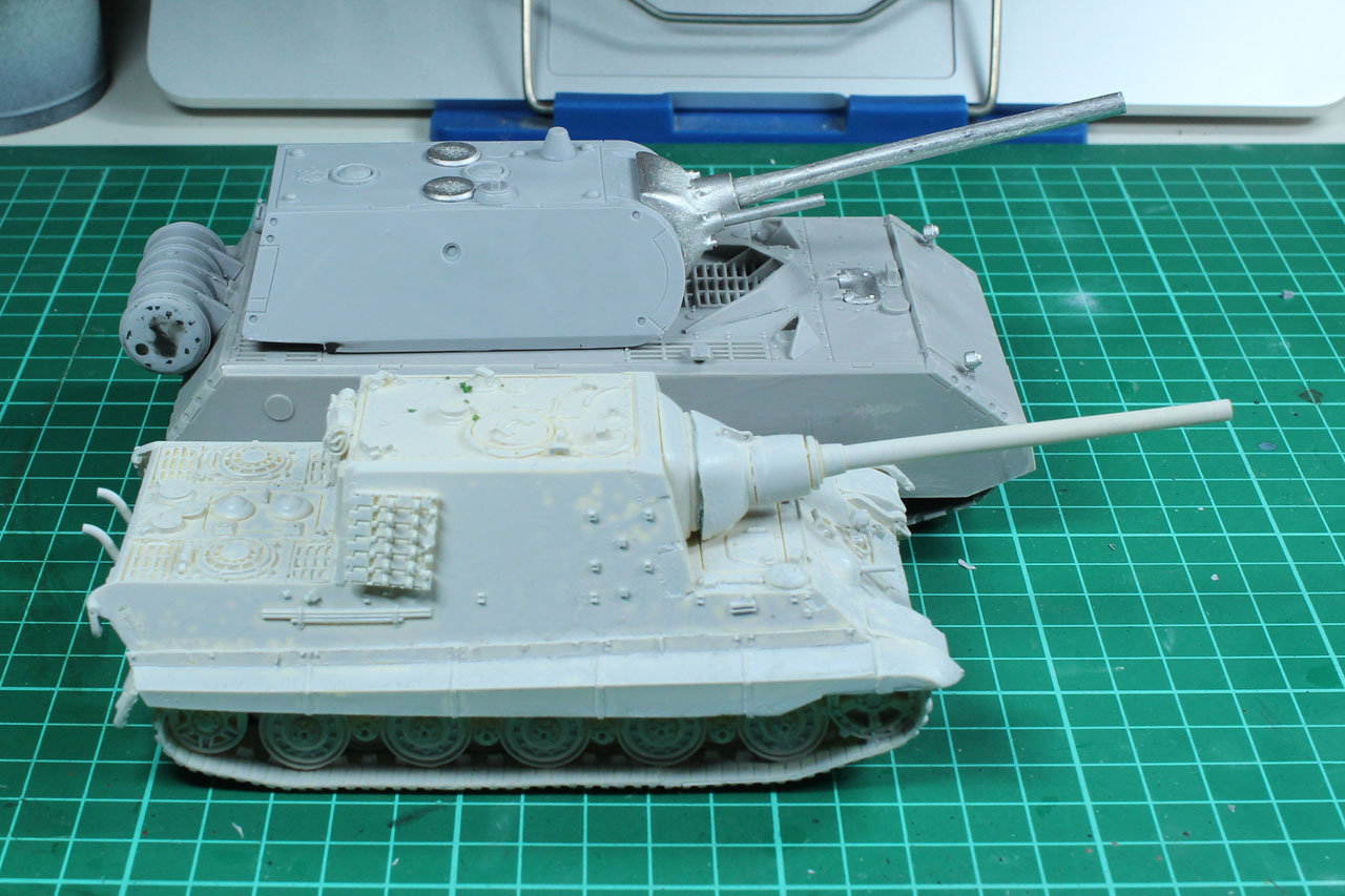The fuel tank is added to the back of the hull by a connection joint. This is the only resin on resin build process of the tank. As the gun mantlet is massive and the 128mm KwK 44 is rather long, I decided to pin them to the turret. Drilling through the socket of the mantlet into the turret and drilling again from the other direction into the gun, so you can pin all three parts directly together.