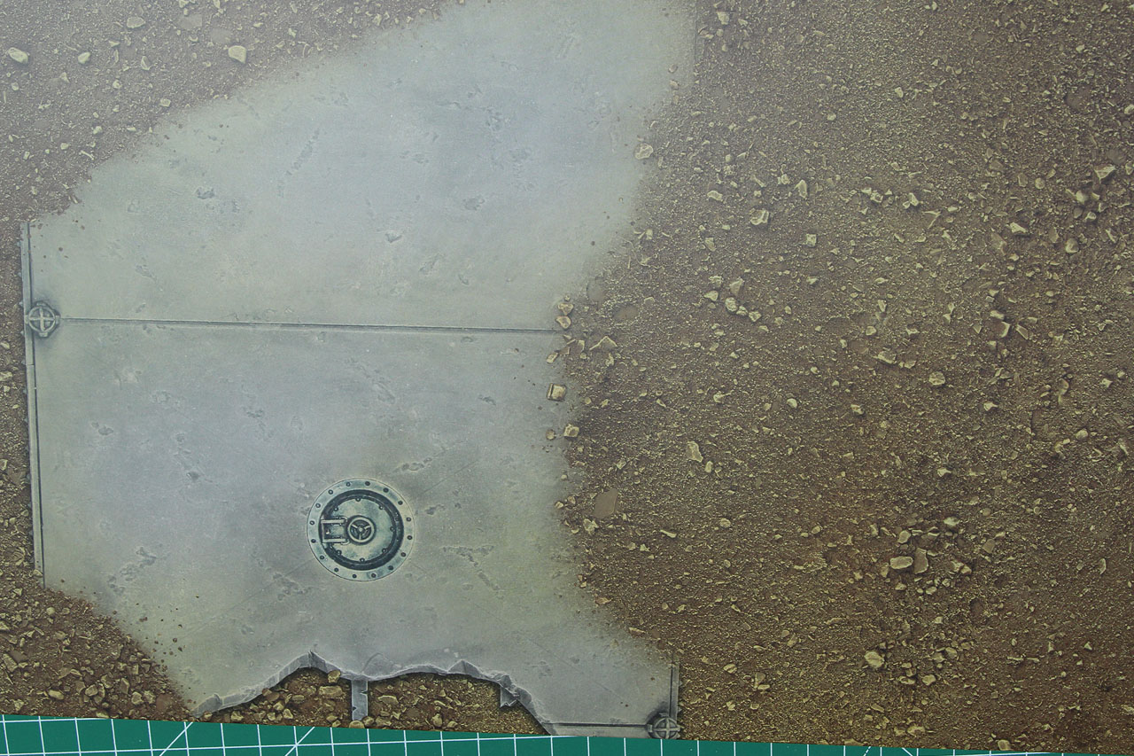 Here you can see it next to one of the smaller fields, that were part of the Killzones or Speed Freeks. Once of the four sides is slightly more reddish, a discolouration or off-colour which can happen during printing. But that is not a big problem. A bit more irritating is the rather random looking design of the ruins or base plates. As you can see, the middle picture covers a road that ends nowhere and is not picked up on one of the other designs either.