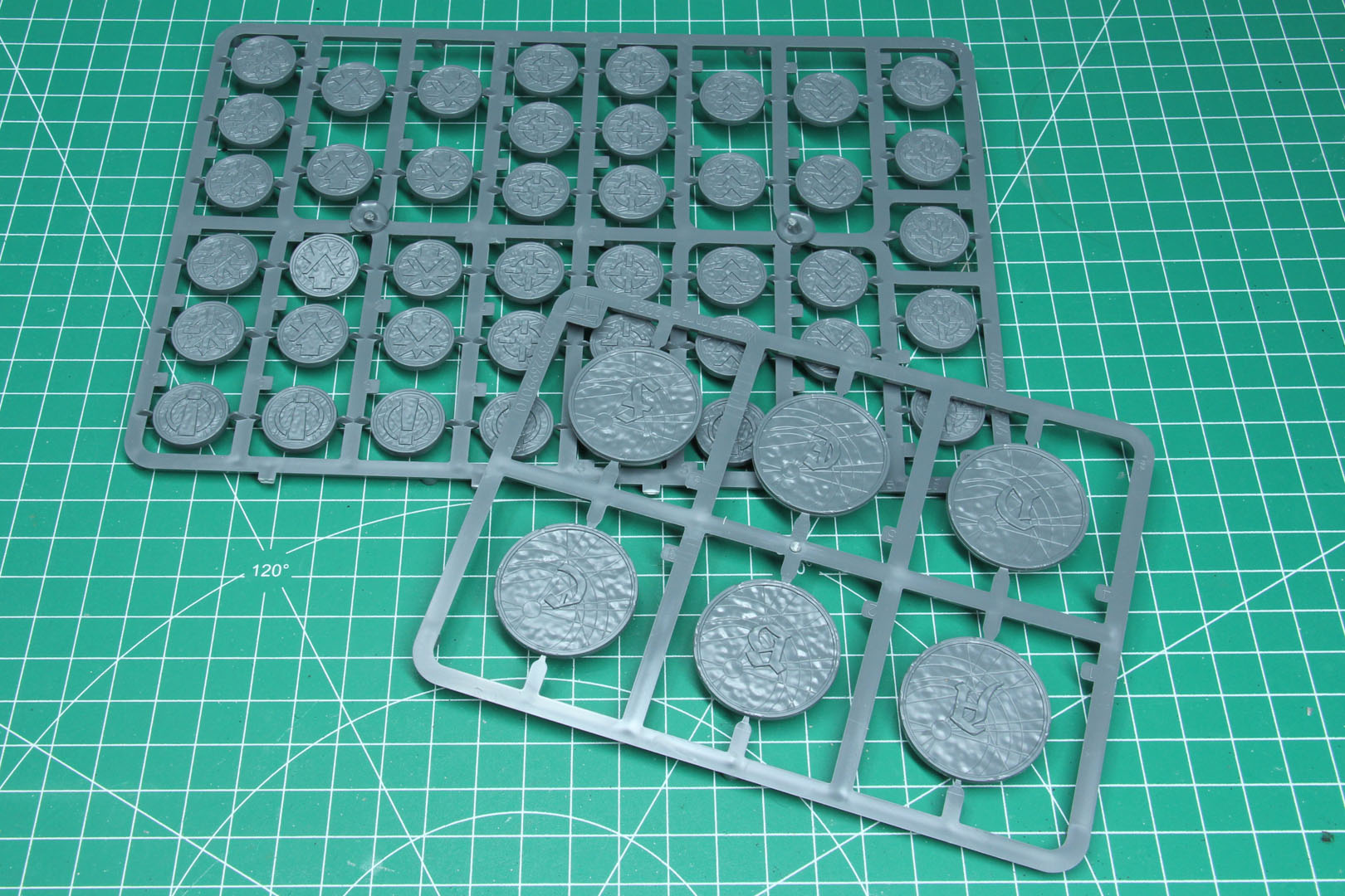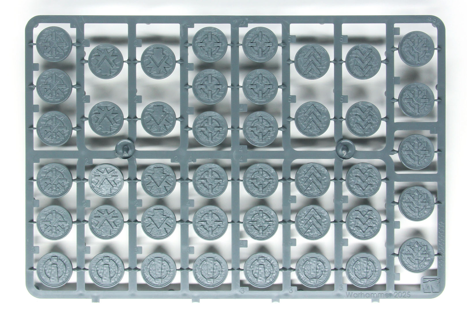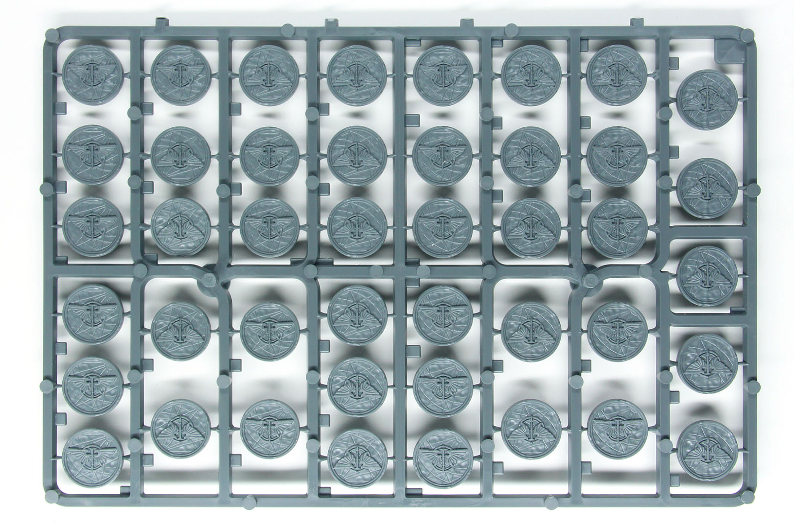 The Order Tokens are split between two sprues: a medium-sized one with 43 tokens and a smaller one with six Objective Markers. The casting is clean with only minor mould lines. I should mention that these were cast in the UK, which isn't always the case with gaming accessories (some terrain kits, such as the Battlefield Trophies, Void War and Shattered Dominion bases, were produced in China).