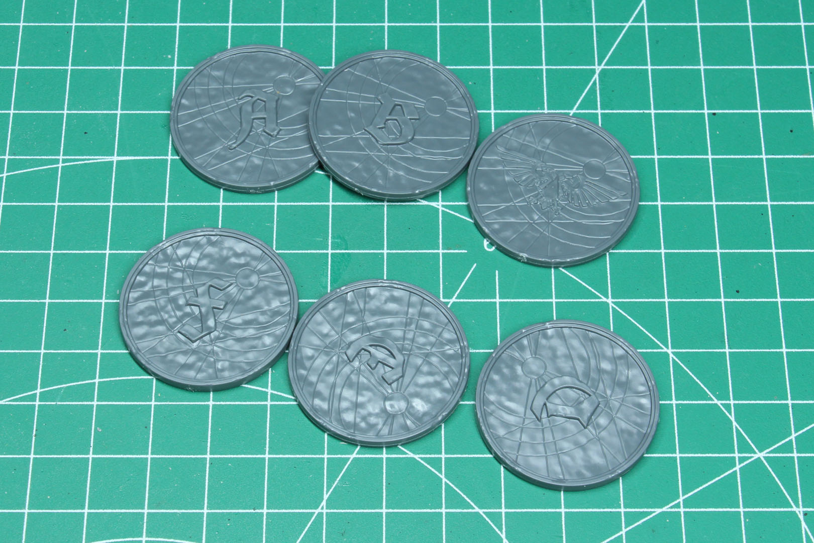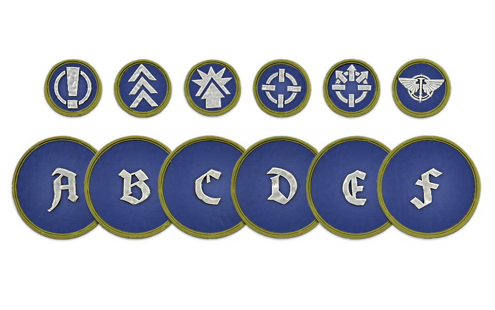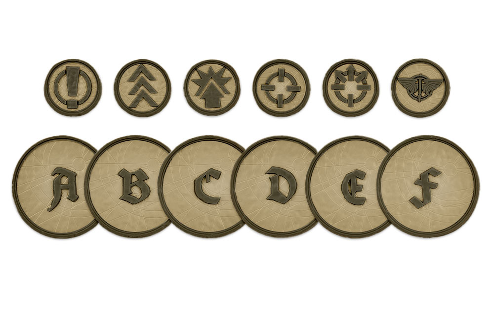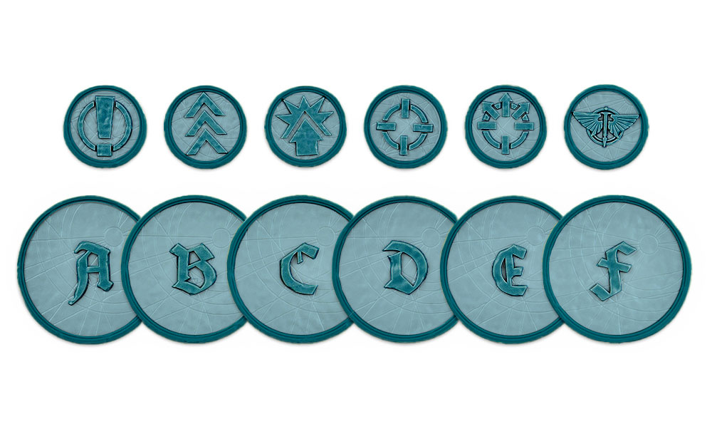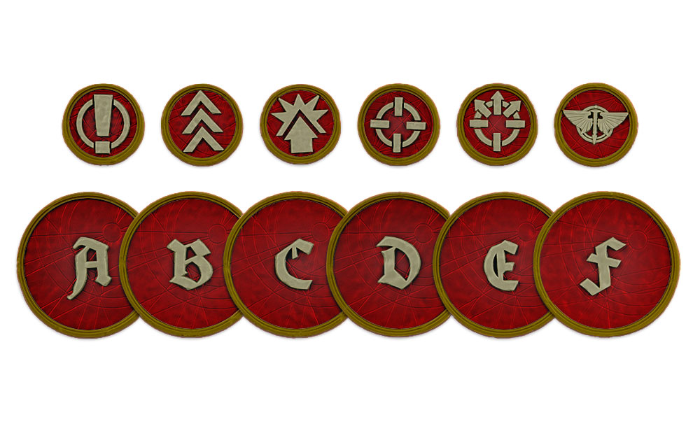 The objective markers are approximately 32mm in diameter and feature the letters A to F on the front side and the Legions Imperialis icon on the reverse.