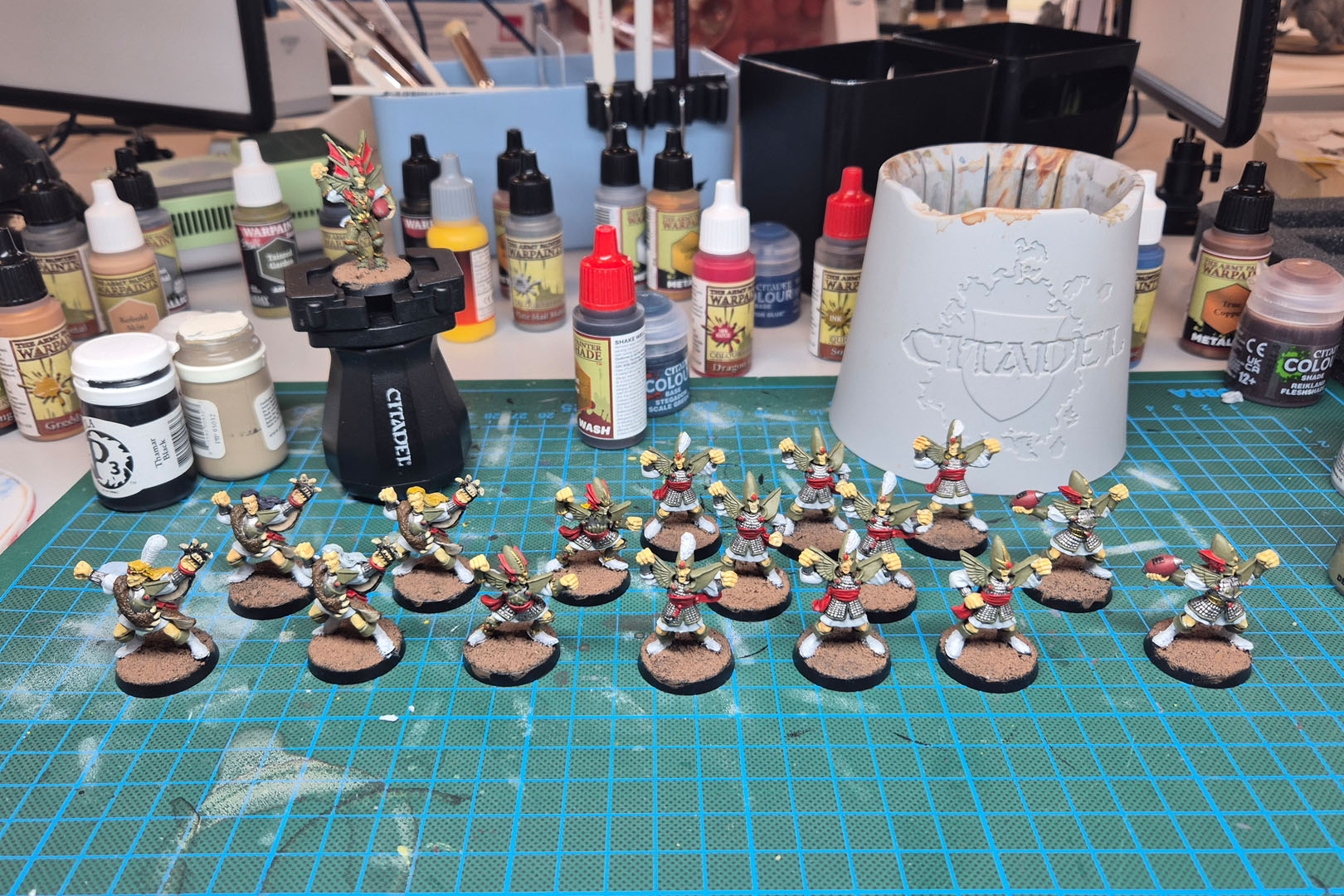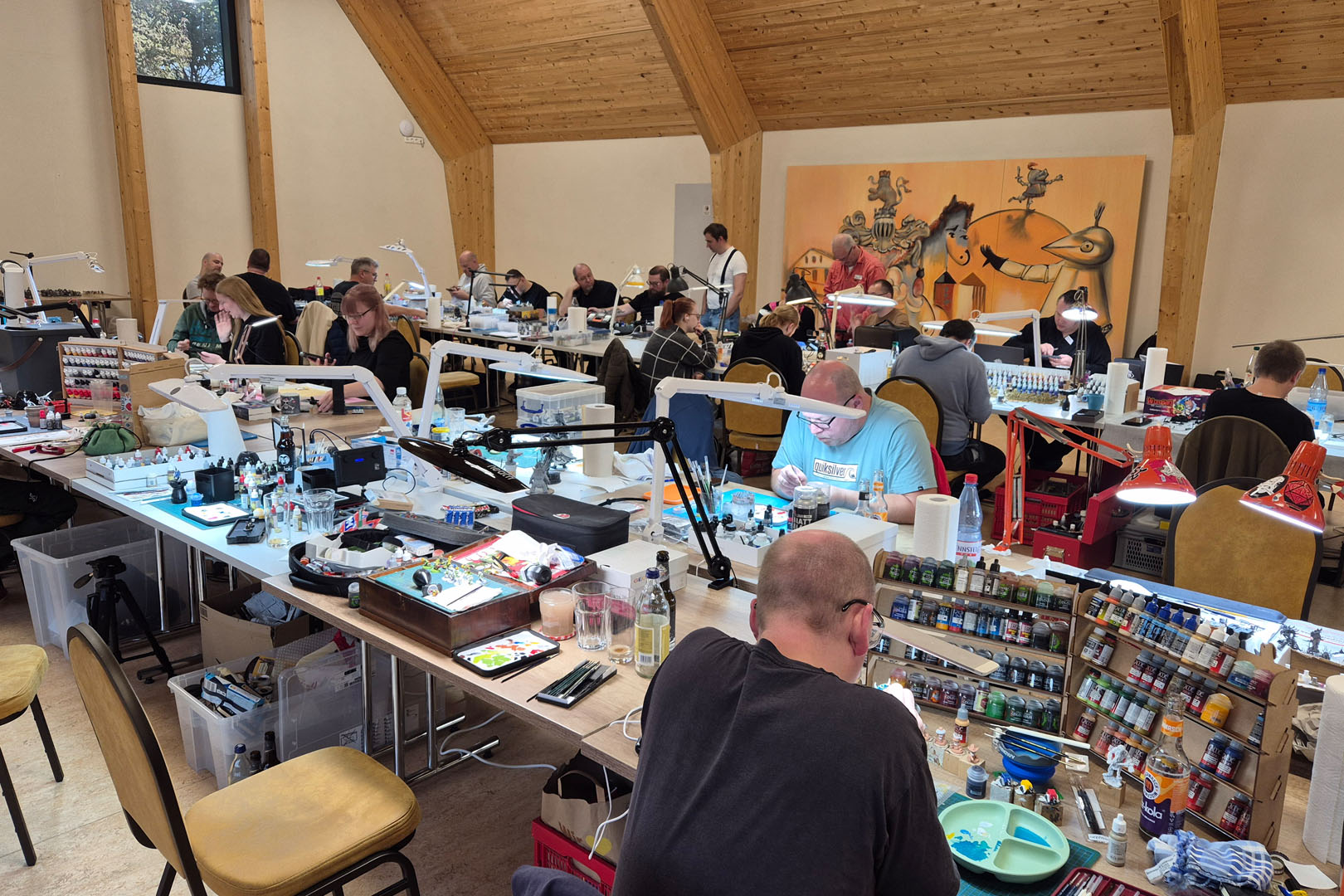 There were just under 35 of us and we found plenty of space in the knight's barn. The large tables and generous lighting created a good atmosphere even before we had unpacked our things. We painted, sculpted, primed and rebuilt, and took the opportunity to exchange ideas. Creative block? Not here! We asked our neighbours at the table, and we were able to continue. This is something I have always appreciated about painting sessions, and I am enjoying it very much here again.