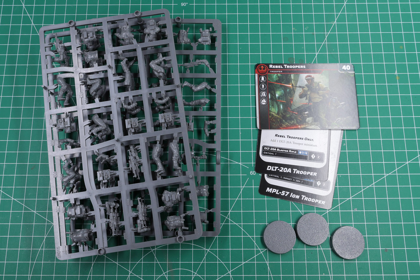 A squad of eleven Rebel Troopers can be built from three sprues (two SWQ15-1s and one SWQ15-2). The models come with a small deck of cards covering the unit and upgrade options, as well as 27 mm round bases. Atomic Mass Games displays the included cards on the unit sub-page, and all cards are available in four languages: English, German, Spanish and French.