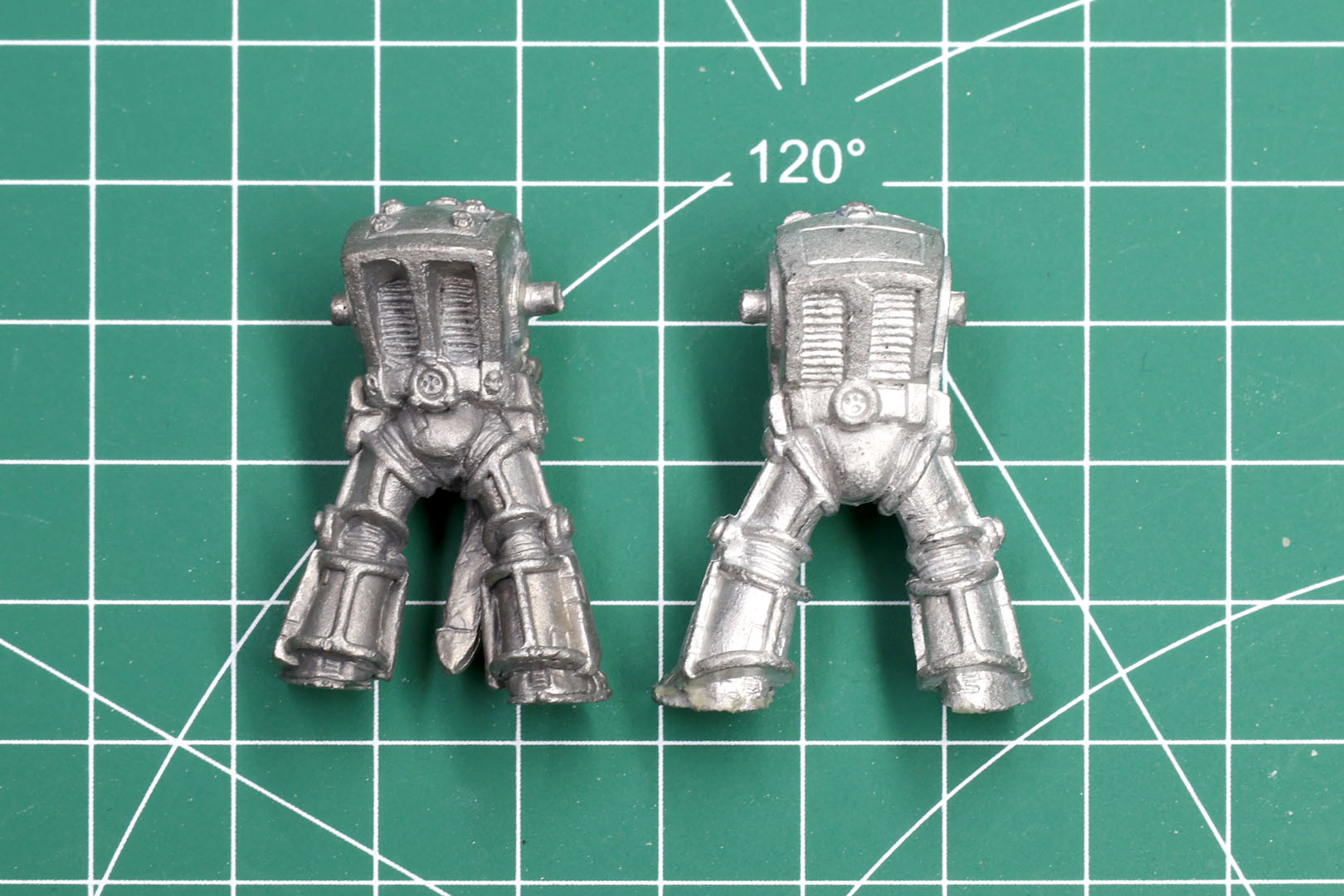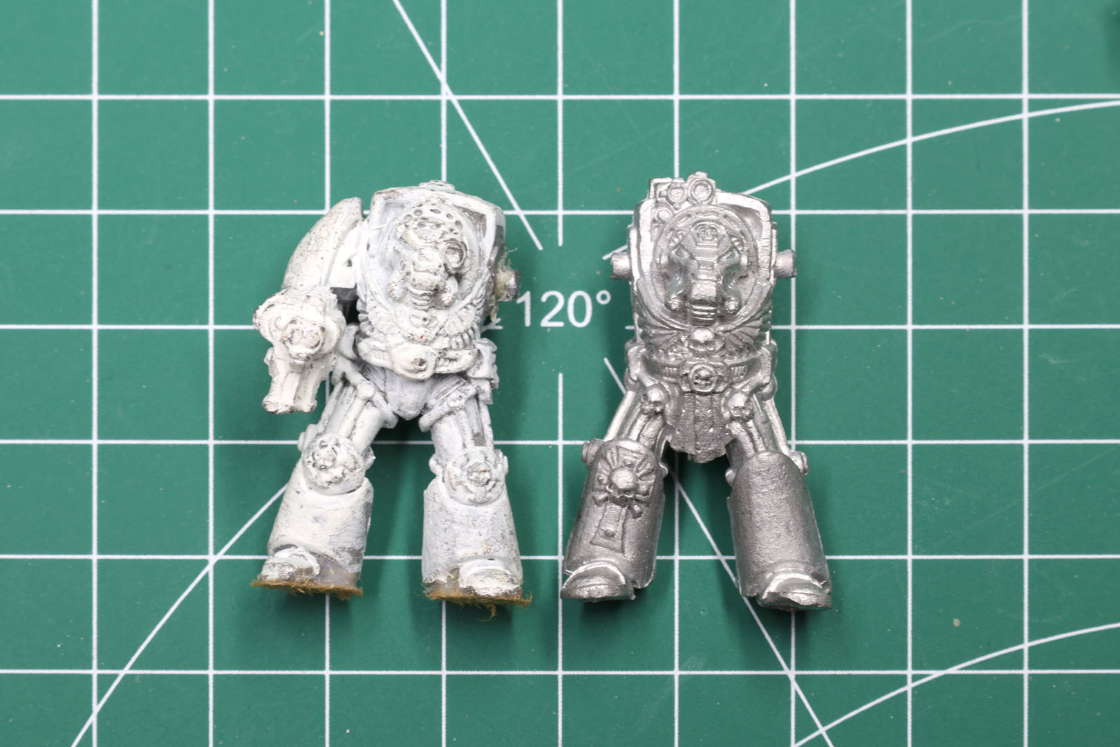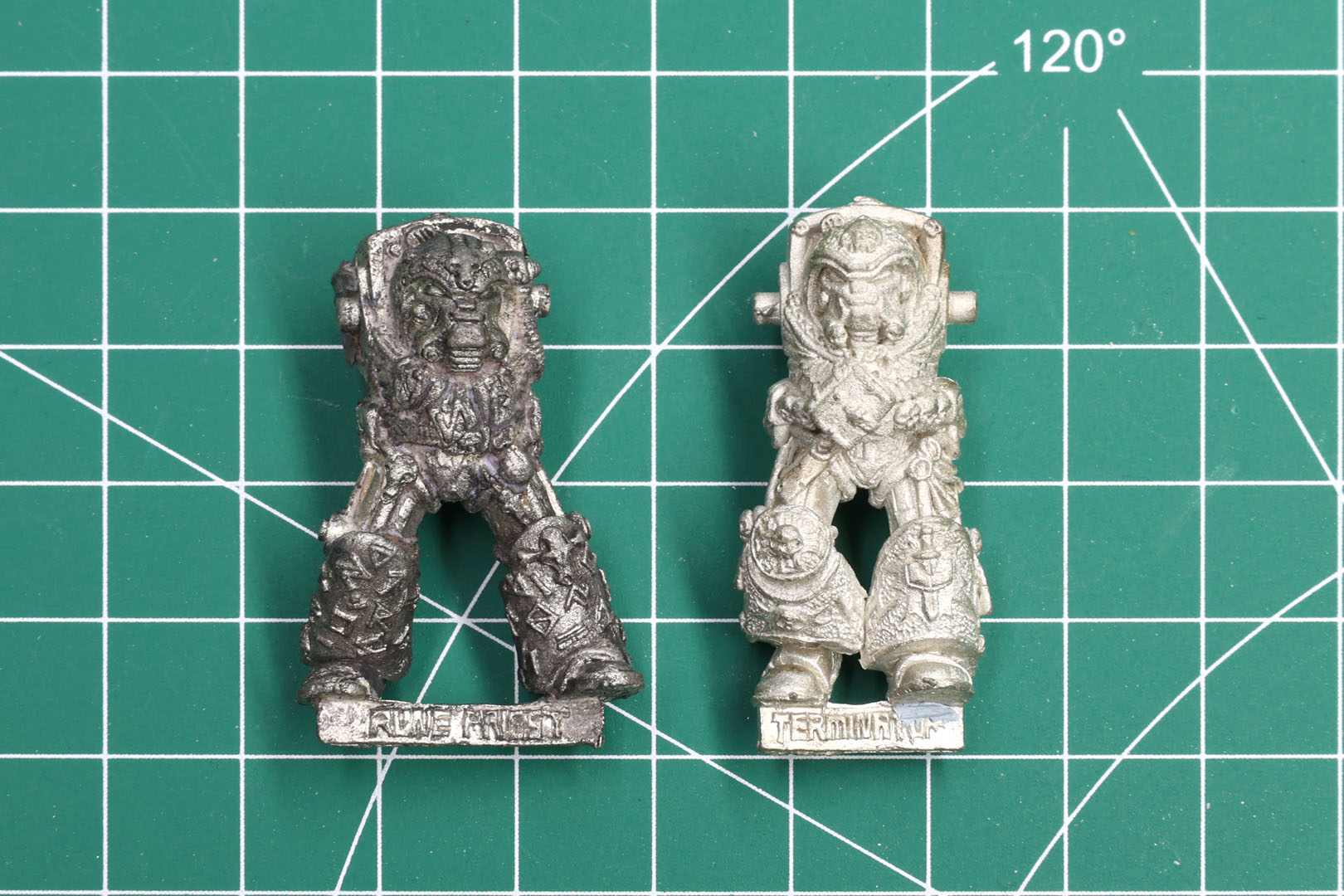 To give you a better understanding to identify these miniatures, I prepared some side by side comparison shots. As you can see the early Rogue Trader Terminators / RTB09 are a bit more rounded and have smaller/softer details. The miniatures tend to be a bit smaller in general compared to their 1993+ counter parts. If in doubt, the best way to identify the early sculpts from the later ones is by looking at the back, as the vents have deeper grooves for the vents.