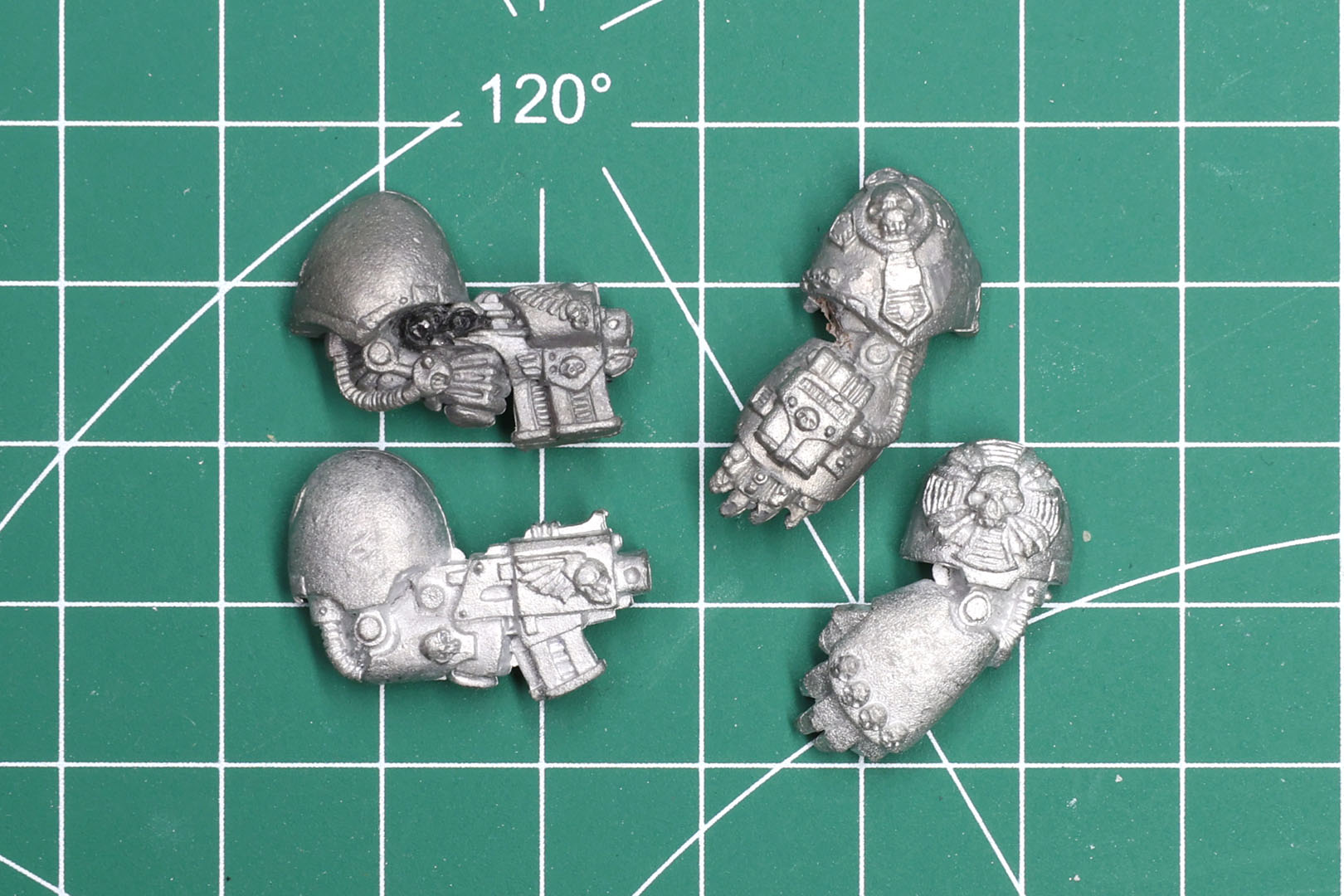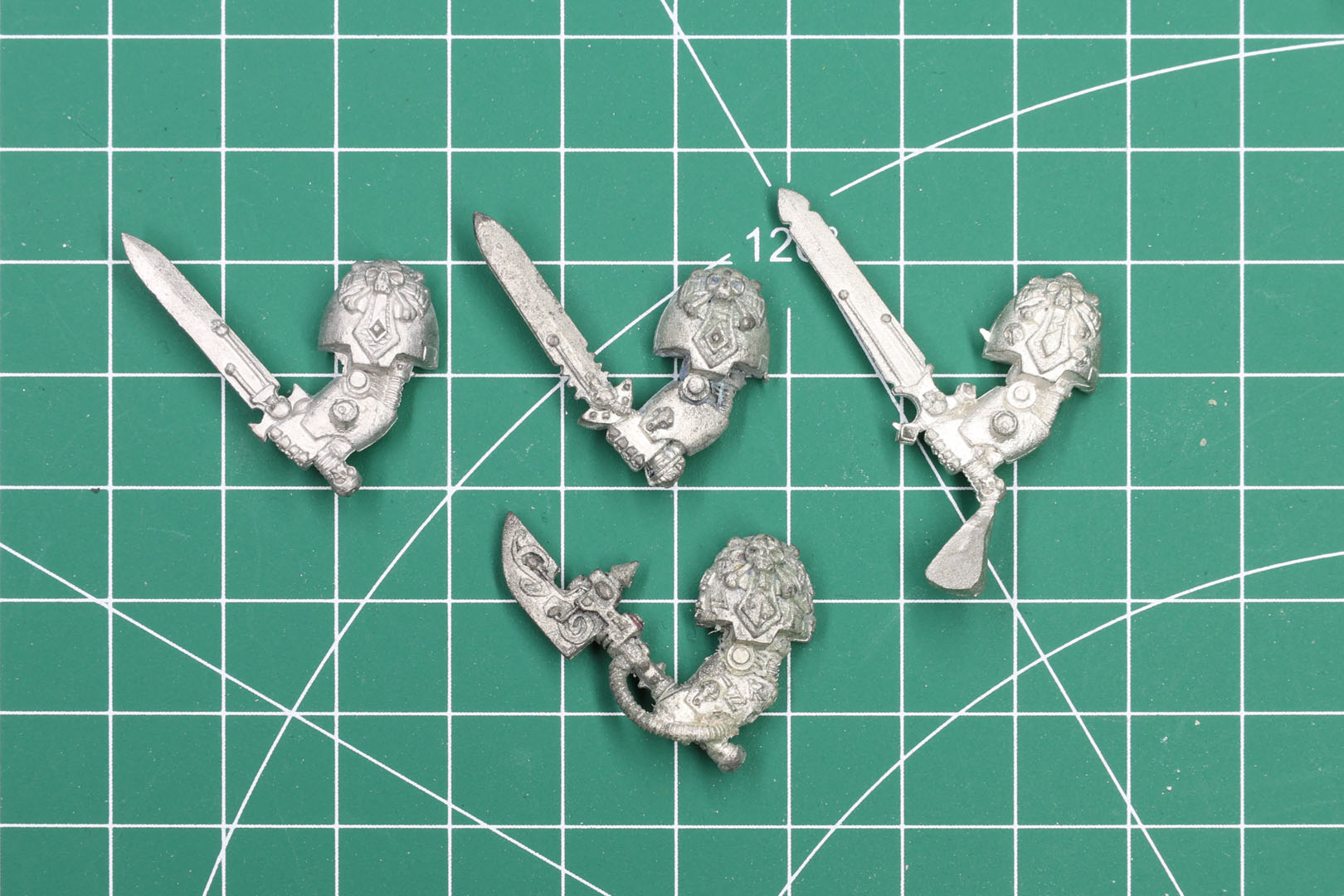 As mentioned above, the 1993+ sculpts had variants for different chapters. Here you can see the three different power swords of the Sgt / Captain next to each other (regular left, Space Wolves middle, Dark Angels right), along with the ornate force axe of the Space Wolves. And the different types of stormbolters, with Dark Angels, Ultramarines, Space Wolves and Imperial Fists bottom right.
