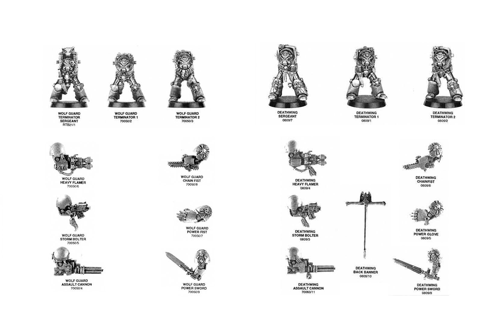 Beginning in 1993 we got new sculpts and poses. Three different bodies for regular Terminators you could mix with the different weapon options. Cyclone Missile Launcher weren't sculpted upon the body, but a part of their own. The targeter and storm shield arm had the tendencies to be mixed up in used lots. For the chapter specific sets, the main bodies got sculpt overs / added details. Mostly wolf skulls and runes for the Space Wolves, and wings and sigils for the Dark Angels. Depending on the chapter, you could easily use some of the parts from the Deathwing for your project (I don't see an issue with my Imperial Fists using the Deathing Power or Chain fist). The Space Wolves had a Runepriest in Terminator armour as well.