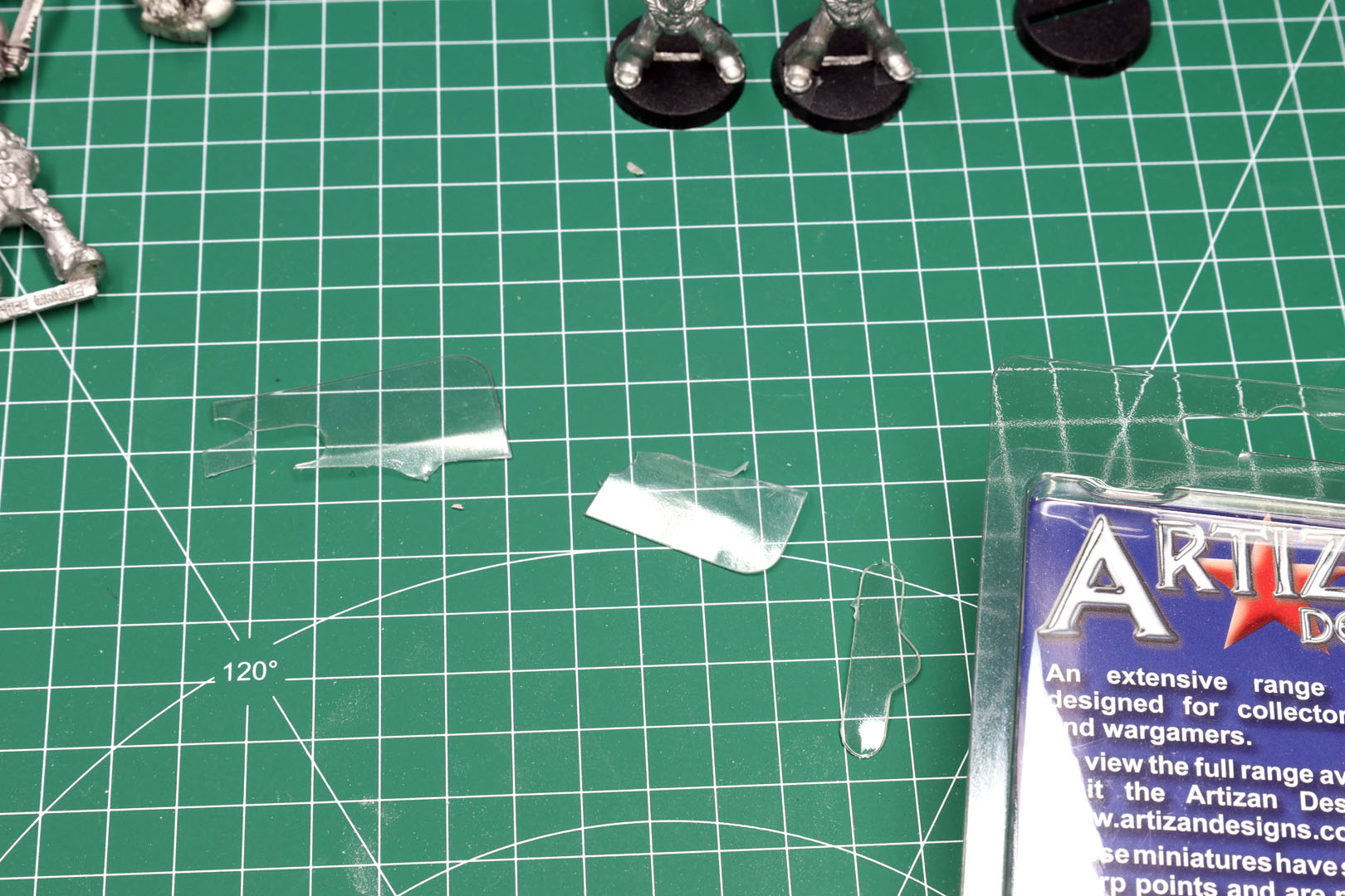 After the clean up and fixing minor damages, I moved on to base the miniatures. The later basing will be kept simple, but I want to avoid the Space Marine sinking into the ground, so I tinkered around giving them smaller "boost" (imagine shoe lifts). I tried cutting up thin bases and the clear plastic from blister packs. You can see in the first picture, the marine to the left has none, the one in the middle the clear plastic and the one on the right a thin plastic sheet. I think the middle version works best.