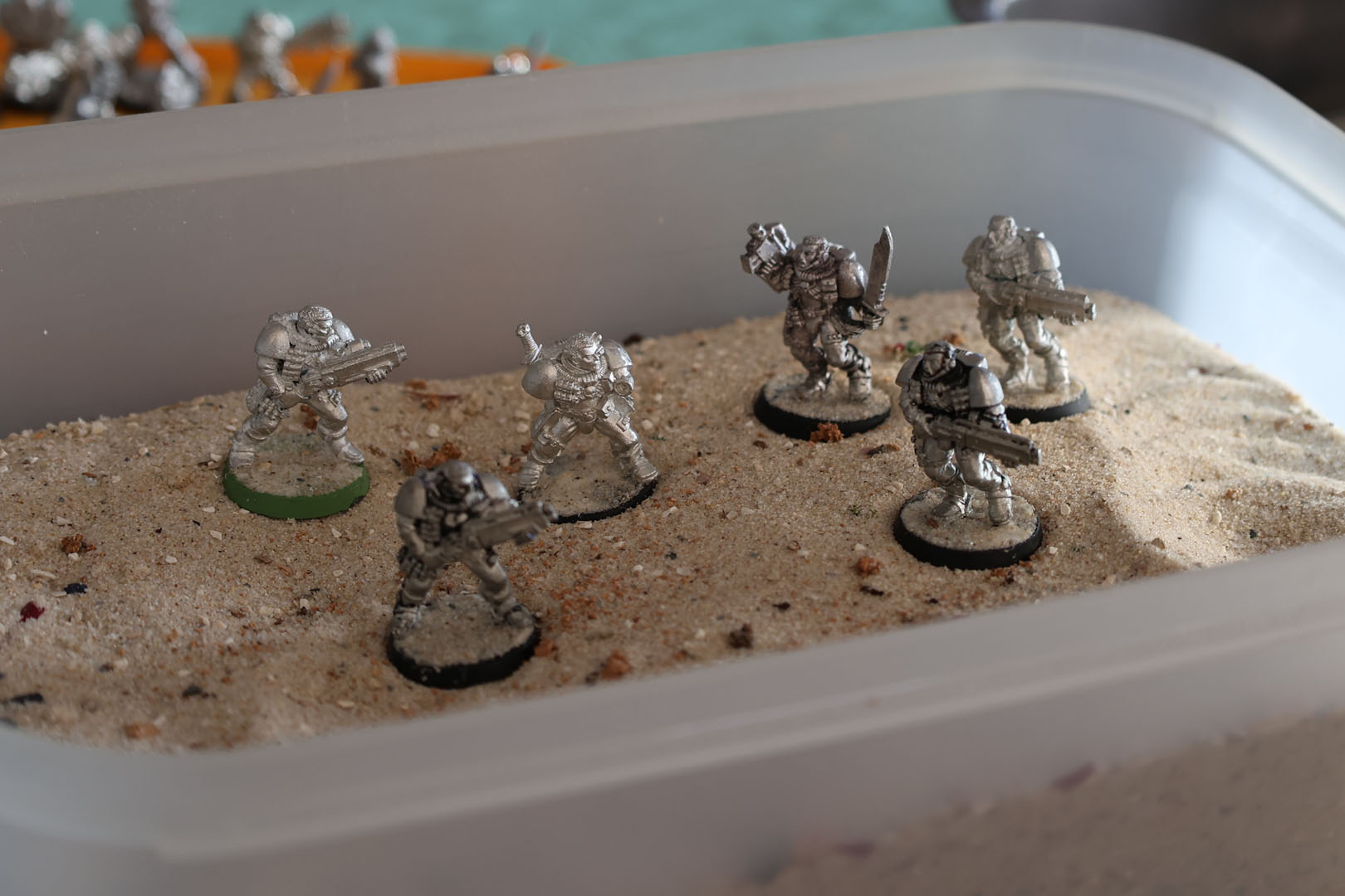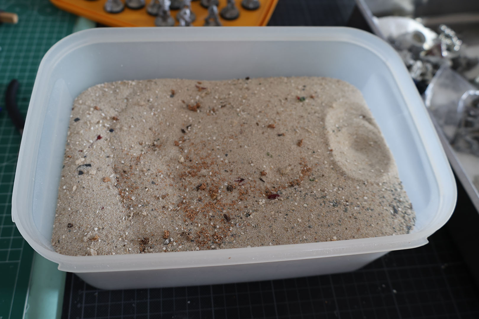 Now with everything prepared, we are ready to base the miniatures with sand. And for that I used my endless pit of sand. Simply old school, using PVA, spread around with a tooth pick or old brush, dip the miniatures in there and let the glue bond.