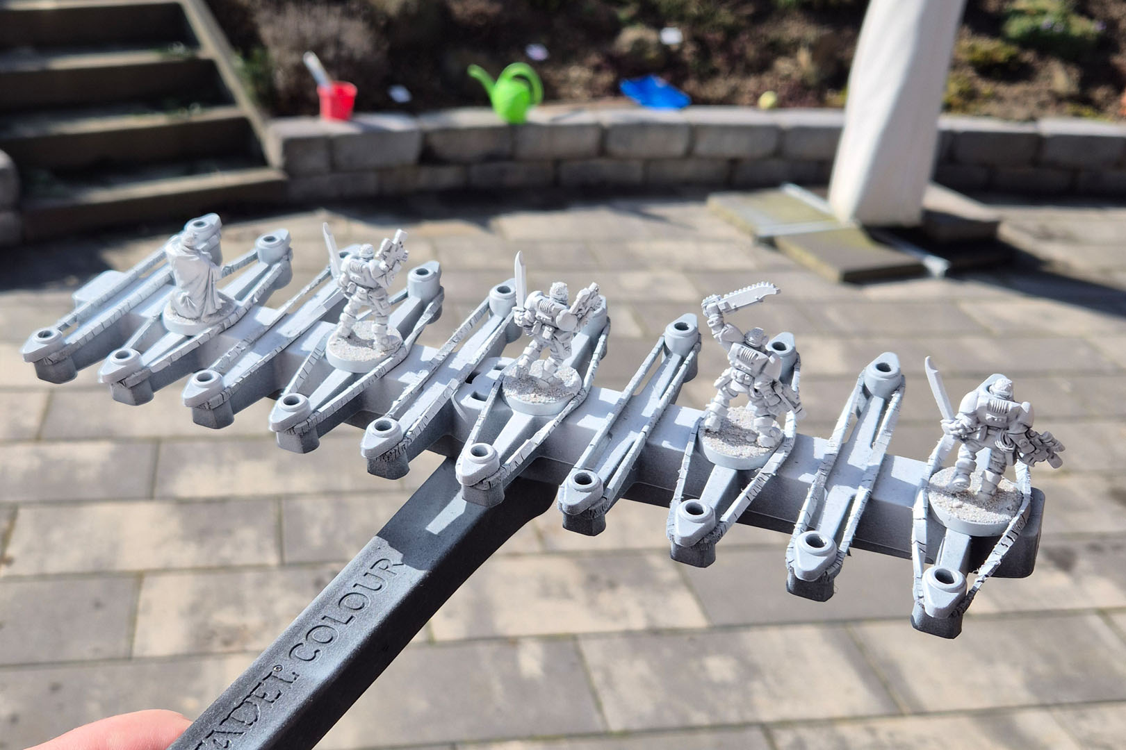 I really dig the Citadel Colour Spray Stick, as it makes bulk painting quite comfortable. And it has these small adapters for smaller pieces, which gave me the chance to prime quite a lot of back packs in one go. And there was it again, how do I paint these properly? You have only a few pictures of miniatures seen from behind. Would the entire backpack be in armour colour? Would it be partially metal and then which parts? I went with variant #2 of my mock up.