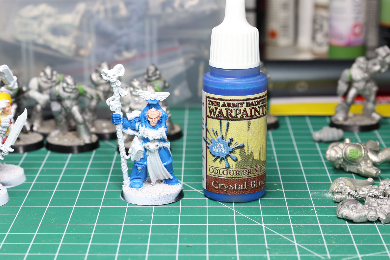 For the Librarian I went with Army Painter Crystal Blue (basically you paint him like an Ultramarine, tons of tutorials online for that), and after initially going with Citadel Mephiston Red for the Techmarine, I replaced that with Army Painter Pure Red (it is closer to the classic Blood Red than AP Dragon Red).