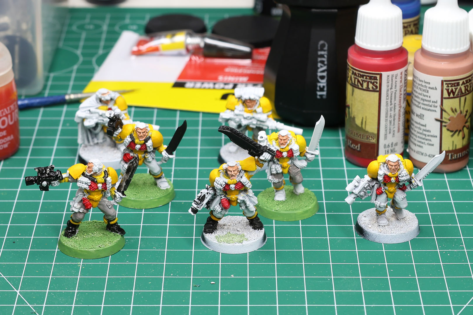 And that was, what I did with the others. White primer first, for the entire batch and those miniatures, where the yellow would be the majority of the model, another coat of the yellow. Touch ups with Yriel Yellow as mentioned above.
