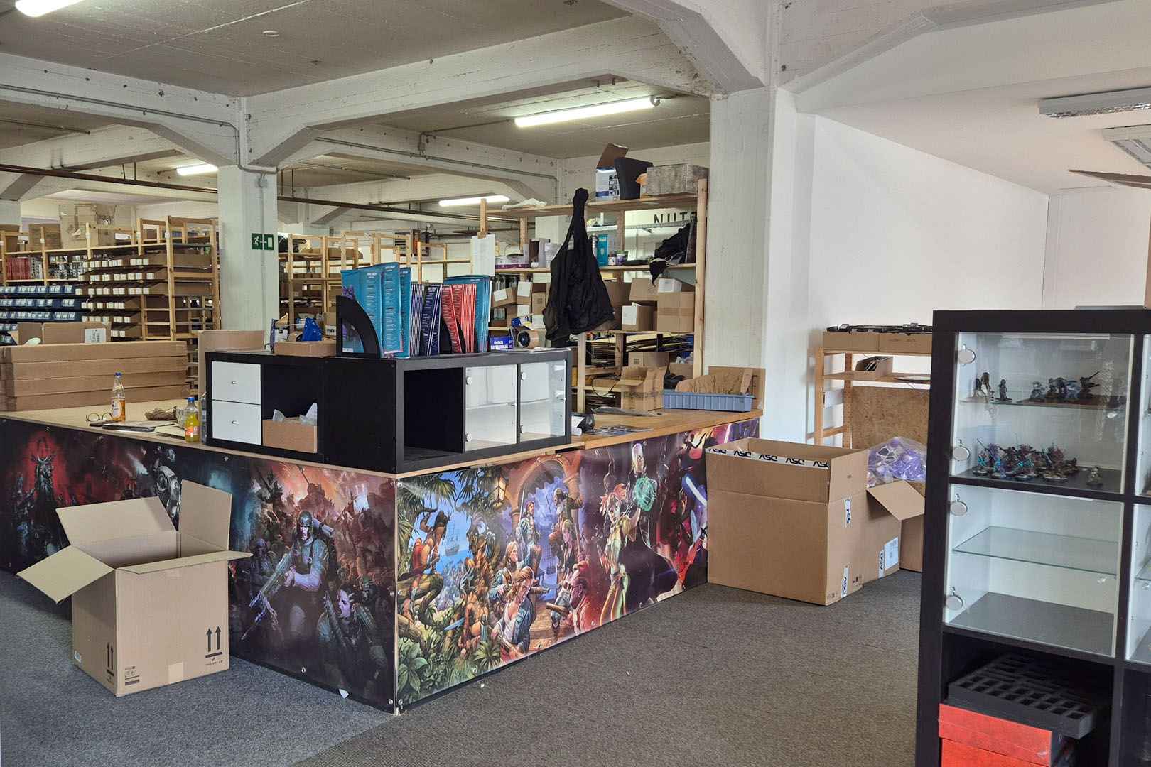 As they recently moved, not everything was in its final place yet, but I was allowed to take a few pictures and give you an impression of what is going on there. The space includes a checkout area, several cabinets, and plenty of tables. Especially on the weekends, there is a lot happening, and with boxes full of terrain they are easily able to host mid-sized to larger events.