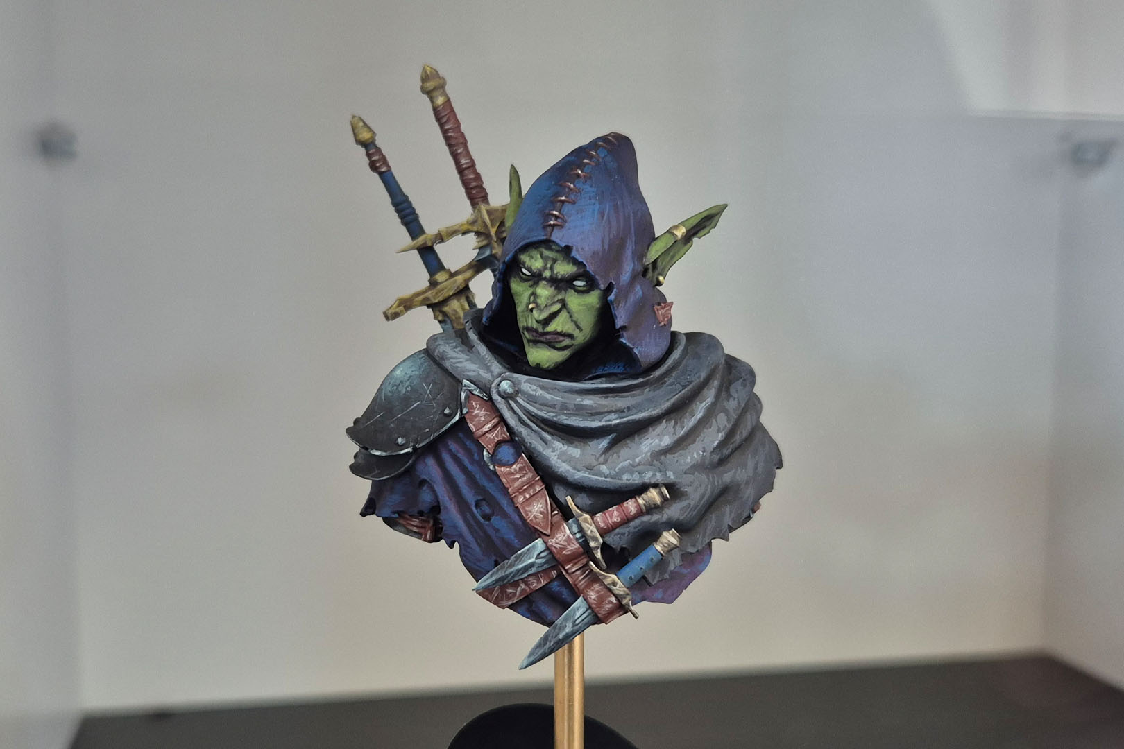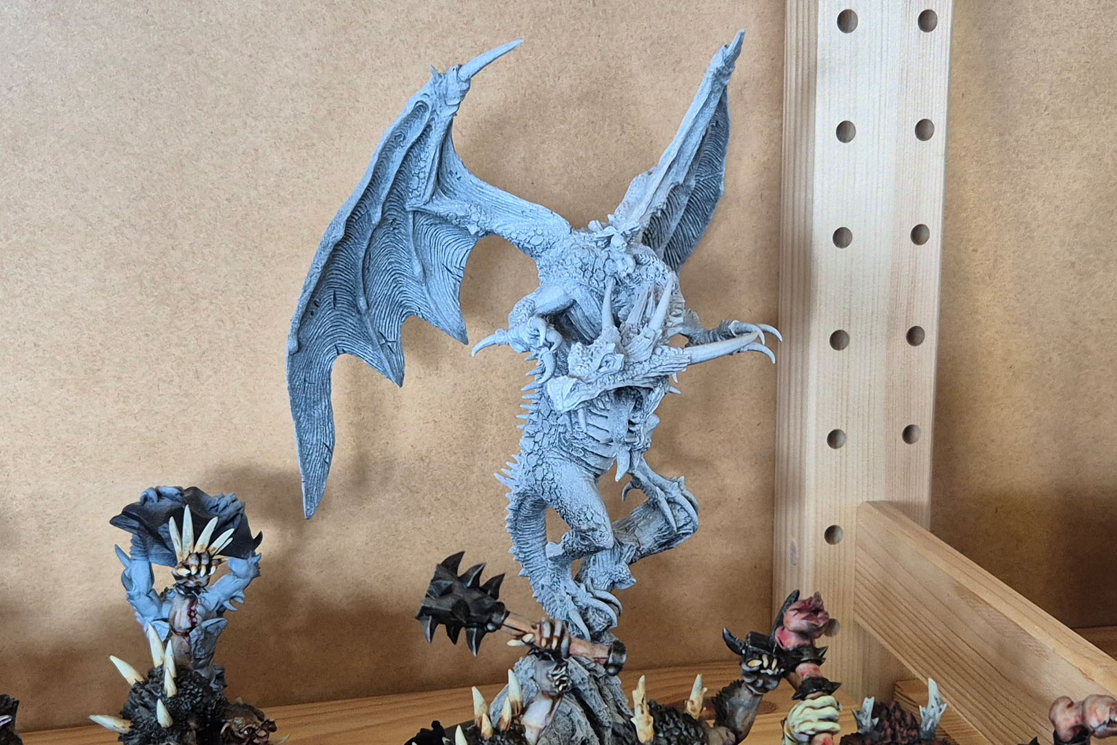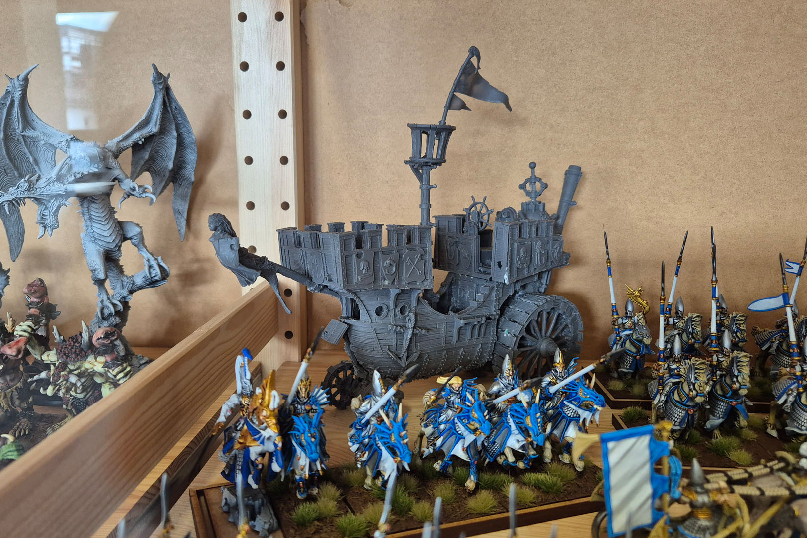 The cabinets displayed projects from both gamers and employees, including a few unusual highlights. Beside the very well done bust of a Goblin Rogue, the old Marienburg Landship caught my eye, as did the carmine dragon. Both are from Warhammer Forge. The break room even had a painting area, where employees work on their armies during breaks, which adds a nice hobby-first touch to the whole place.